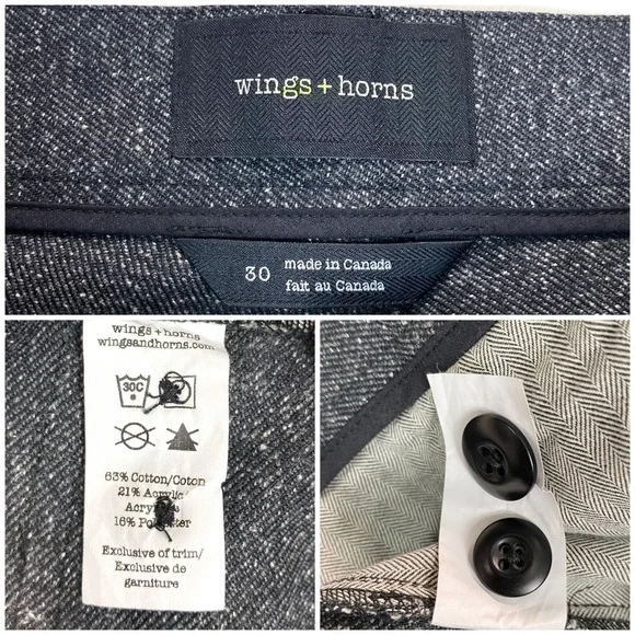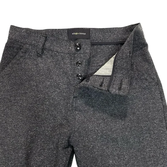 Wings + Horns Twill Tweed Slim Fit Pant in Gray Size 30W 16”H 19”Rise 11.5”Lengths 39.5”Inseam 28.5”Color : Gray Rear patch pockets with flap closureDouble-layer belt loopsButton flyFront slant pockets with herringbone liningCrotch gussetSlim fit pant with custom corozo military buttons in twill tweed.New Without Tags !!