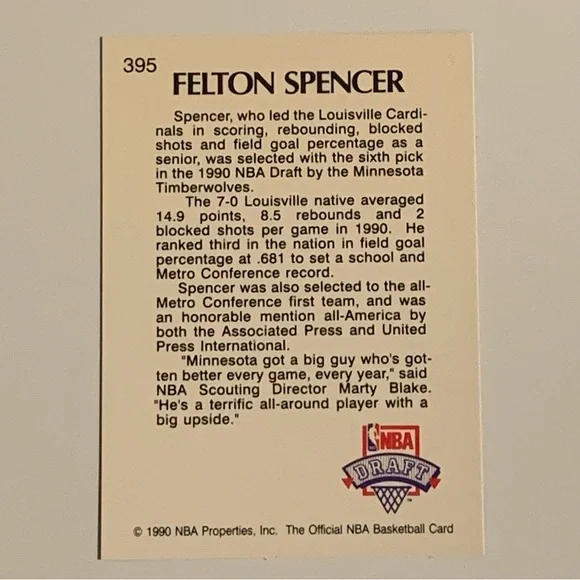 ABOUTFelton LaFrance Spencer was an American professional basketball player who was a center for the Minnesota Timberwolves, Utah Jazz, Orlando Magic, Golden State Warriors, San Antonio Spurs, and New York Knicks of the National Basketball Association from 1990 to 2002.Capture a piece of basketball history with the 1990 Sports Trading Card featuring Felton Spencer of the Minnesota Timberwolves.This card, number 395, is a must-have for collectors and fans alike, offering a glimpse into the early days of an NBA journey.With its near mint or better condition, this card is a pristine addition to any collection, celebrating the legacy of the sport and the athletes who make it great.Perfect for displaying your passion for basketball and the NBA, this card is a slam dunk.Sport: BasketballPlayer/athlete: Felton SpencerSeason: 1990-1991Manufacturer: NBA HoopsTeam: Minnesota TimberwolvesLeague: NBAType: Sports Trading CardYear manufactured: 1990Card number: 395NOTE: The product description for the listed items comes from one or more of the following sources: Manufacturer, Wholesaler, Retailer, Packaging, or the creator/designer´s own description, or from a comparable brand with similar design and intended use.Please read the product description thoroughly before making a purchase decision.About me: I am open to fair offers. Items are shipped on the same or the next day. New products are added daily. Thank you for visiting my store. Make the most of your day.