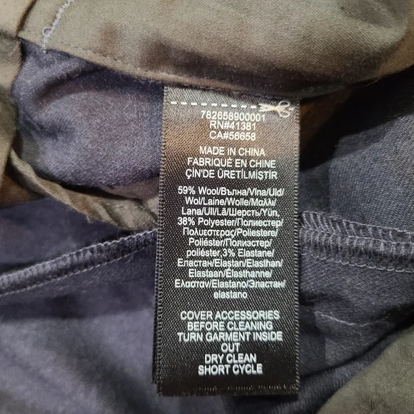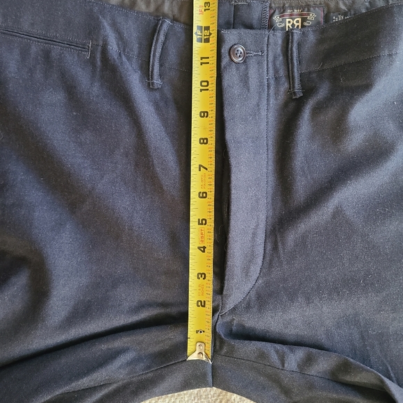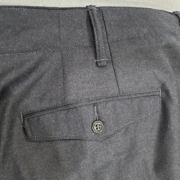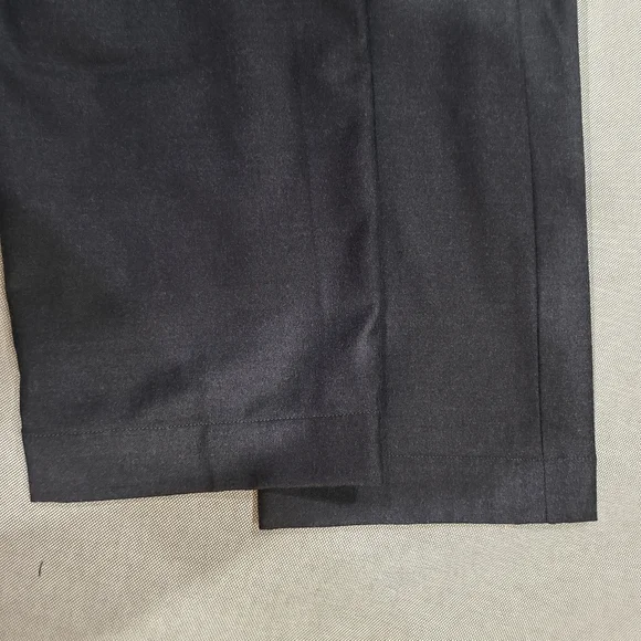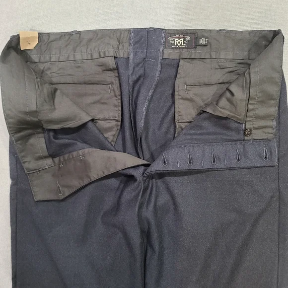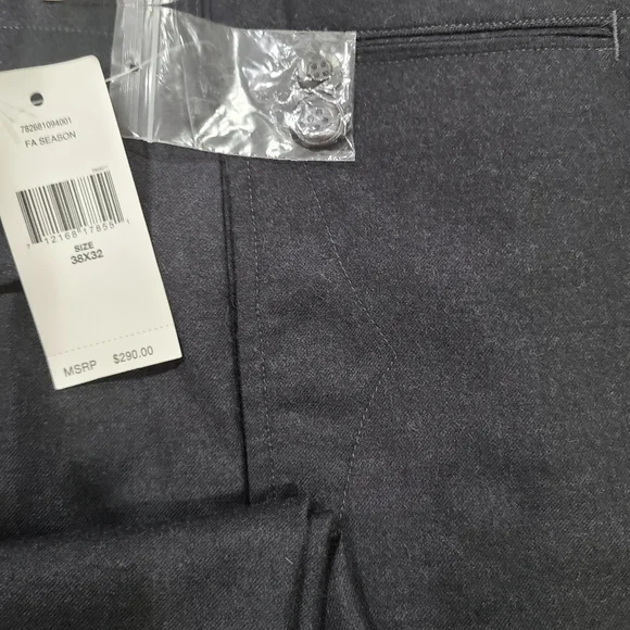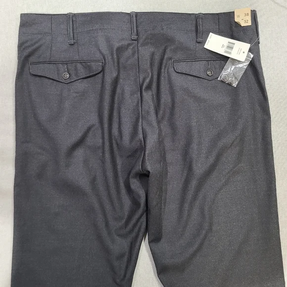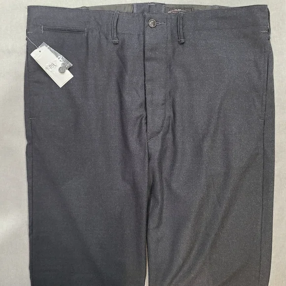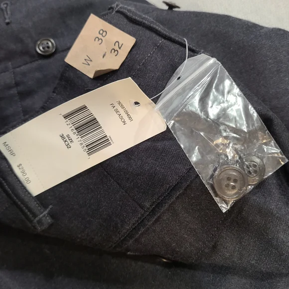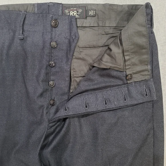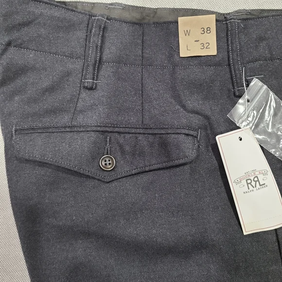 Stretch wool blend grey flannel flat front trousers with a luxurious handClassic trim fit with straight legOld dungaree style belt loops and Western stitching at front pockets on a relaxed cargo (without side pocket) styleThese chinos would look great with a big sweater, plaid shirt, long sleeve T-shirt with a blazer.17" leg ankle openingMoto Boots, Western, combat, loafers, belt, suspenders, sneakers, slip-ons, Oxfords, jean jacket, denim, be a cowboy or a gold digger.