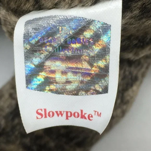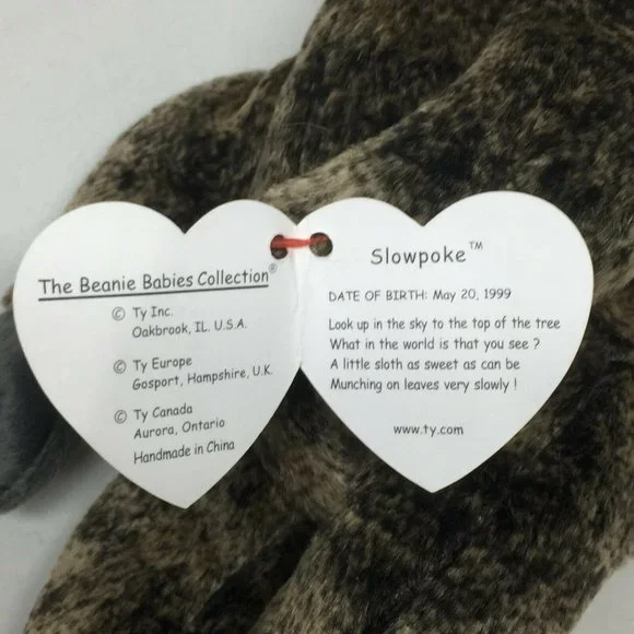 Ty Beanie Baby Slowpoke Sloth Plush Stuffed Animal Retired W Tag May 20 1999DATE OF BIRTH: May 20, 1999Look up in the sky to the top of the treeWhat in the world is that you see?A little sloth as sweet as can beMunching on leaves very slowly!