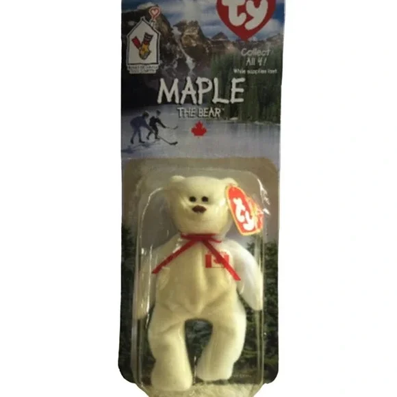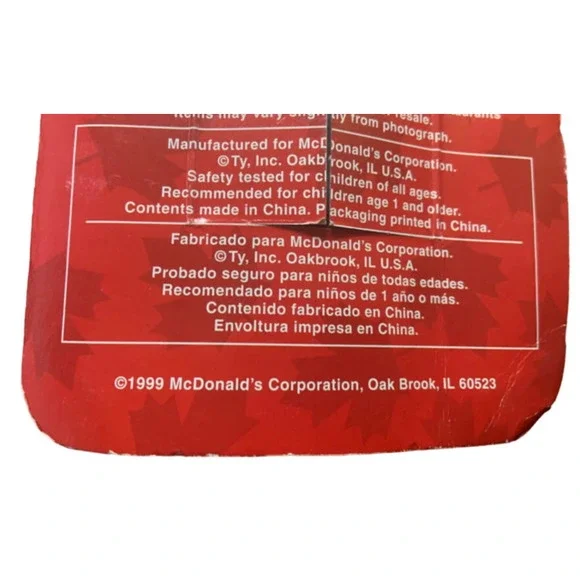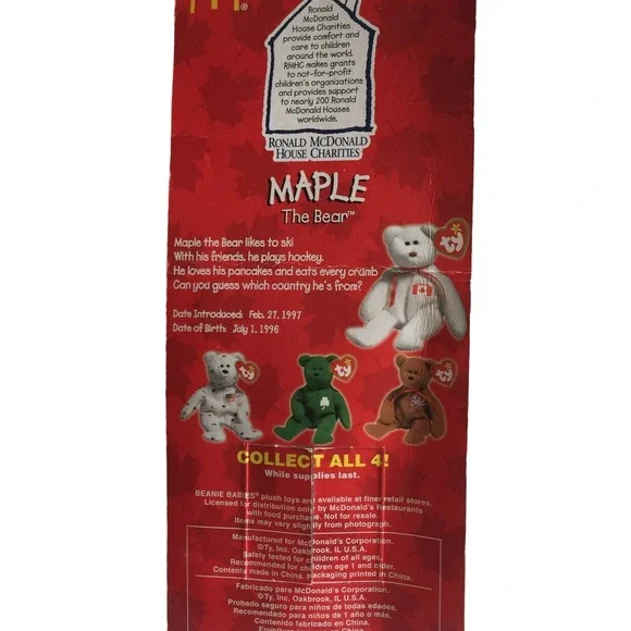 Mcdonald´s ty Teenie Beanie Babies "Maple the bear"Vintage 1999-These were released in June of 1999, and recalled/discontinued within a week-Limited Edition of 4000 -There are three (3) errors of incongruence seen on tags and box:-1)copyright date on box reads 1999, while fabric tag on bear’s butt reads 1993.2) “date of release” and “date of birth” chronologically inverted3) “Oakbrook” is erroneously printed as “Oak Brook” on bottom of back of box.-This vintage item is NEW - never removed from its package -Plastic covering has discolored due to its vintage age-General condition of package is very good