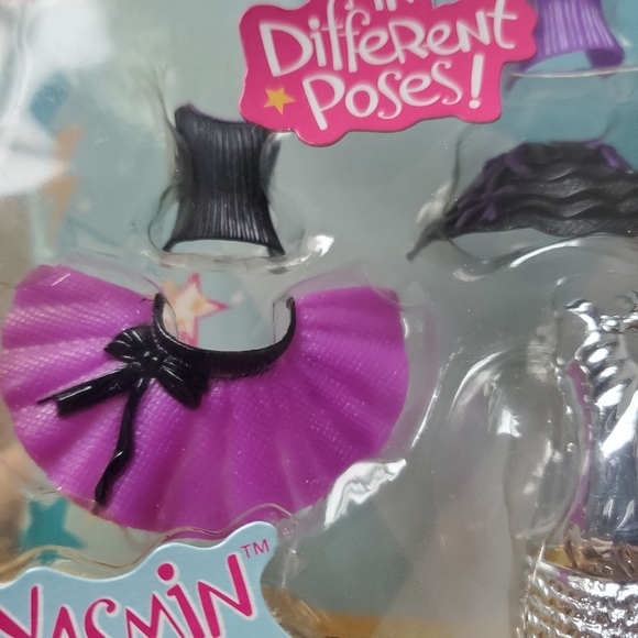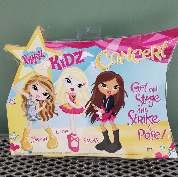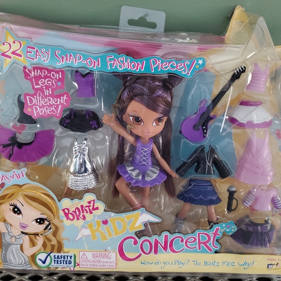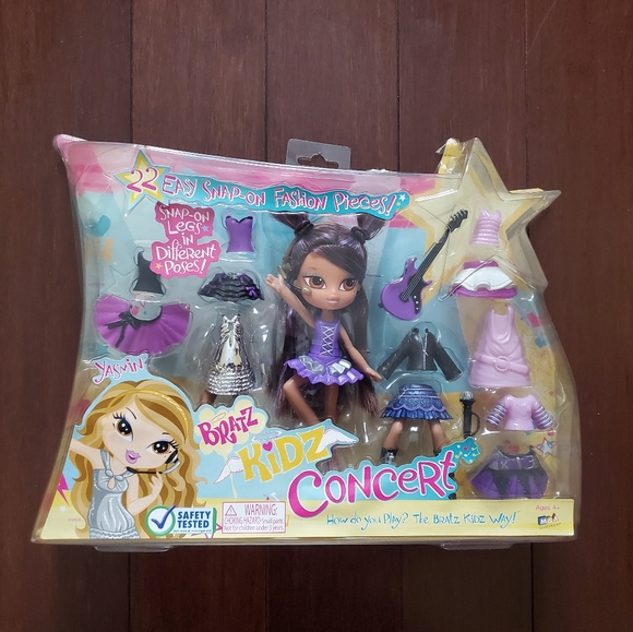 Bratz Kids Snap-On Concert Yasmin - New.22 easy Snap-On Fashion Pieces.I believe this was released in 2008.Packaging is not perfect and plastic packaging is a little yellowed from being in storage for so many years.Although this is new the silver dress has some marks on it and one of the skirts may have some fading, but not sure if it is supposed to look like that or not and the white ruffle on a skirt has a mark of some sort on it.(See last 3 pics).Doll is approximately 7" tall.Priced as is. NOT ACCEPTING OFFERS