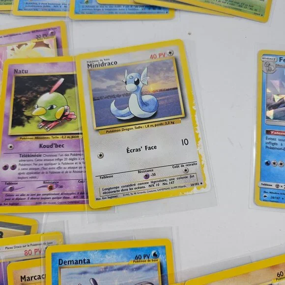 Gotta catch ´em all, especially these vintage gems. Featuring a mix of Pokémon from different generations.• 35+ assorted cards• Language: French• Variety of Pokémon• Energy cards included• Great for collectorsCondition: Pre-Owned Minor edge wear on most cards.3 cards have significant wear (Minidraco, Roucool and Draco) See photos as they are part of the description.