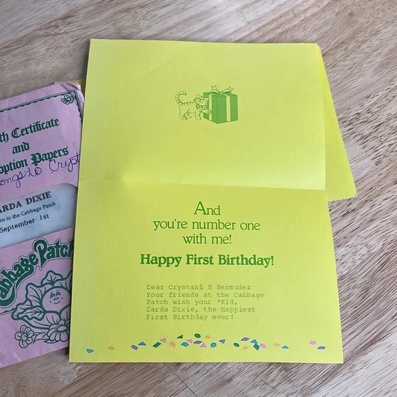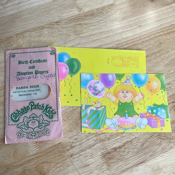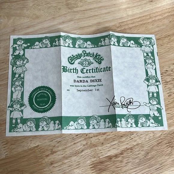 Authentic original cabbage patch kids doll DARDA DIXIEComes with birth certificate and adoption papers and first birthday card.Has a lot of wear for the birth certificateNo...