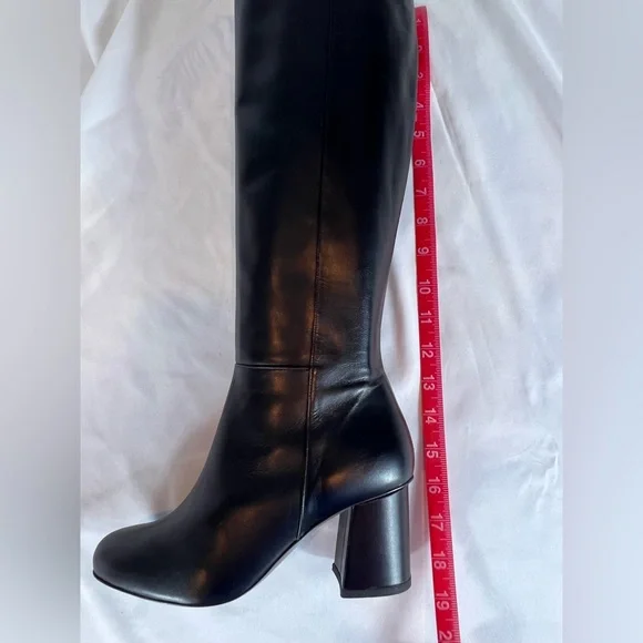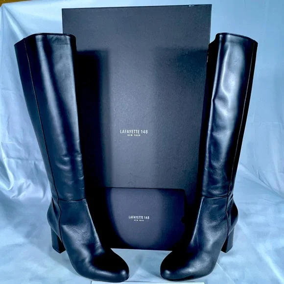 Lafayette 148 New York Nappa leather black knee/-high boot, size 8M/38.New in box, purchased directly from Lafayette 148 with receipt shown. Made in Italy from very butter/soft full-grain, pliable leather. Sophisticated , yet modern and comfortable.Looks great with dresses or leggings. Side zip closure, 2.5 inch heel with cushioned insole. Knee/high boot shaft. -Unworn with original box and packaging included. -Compare with Lafayette 148 current boots retailing for $1298. -Sizing:Lafayette 148 runs 1/2 to 1 size small. Should fit size 7 to 7.5 shoe size. -Non-smoking home