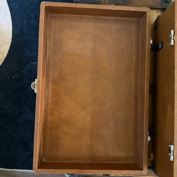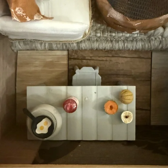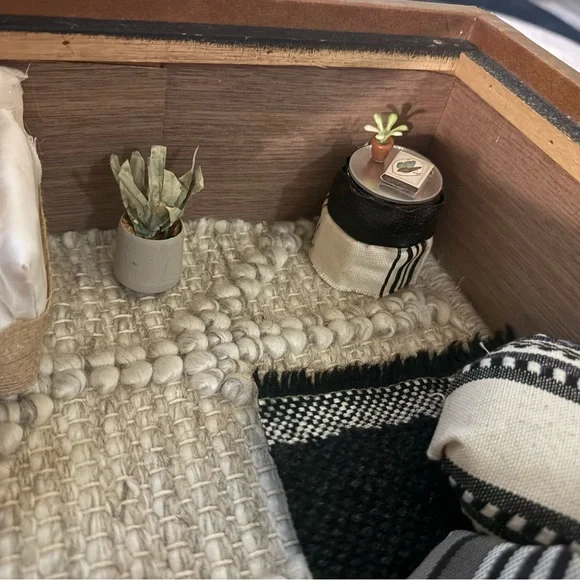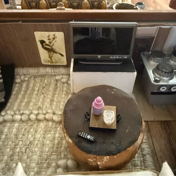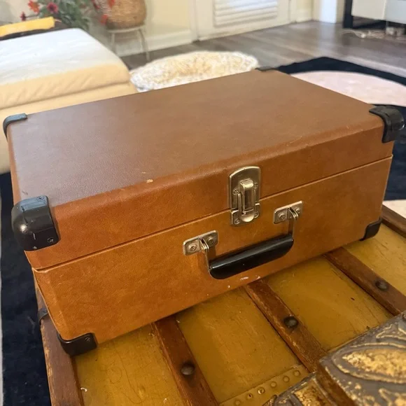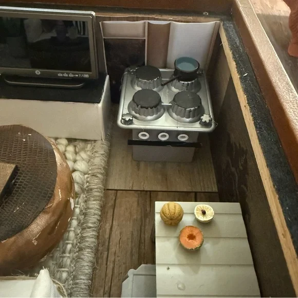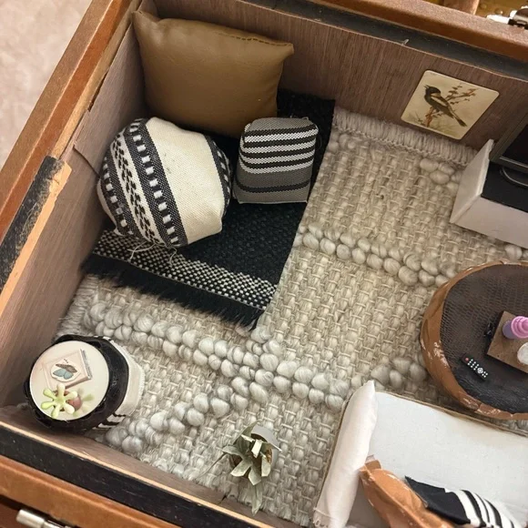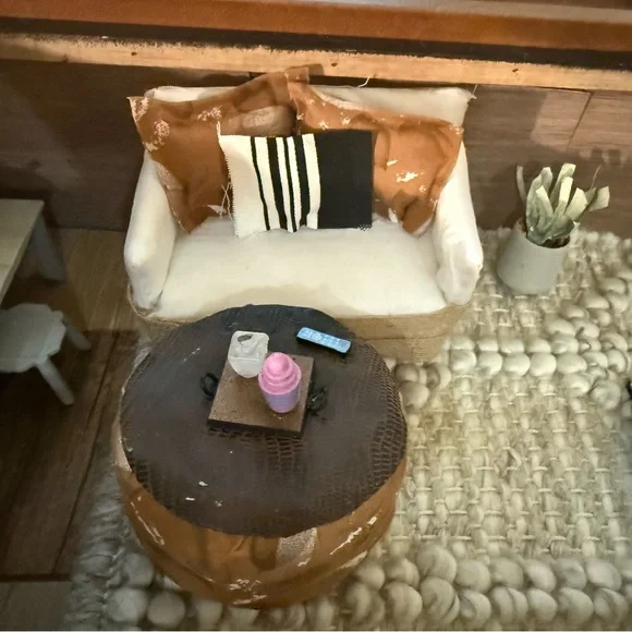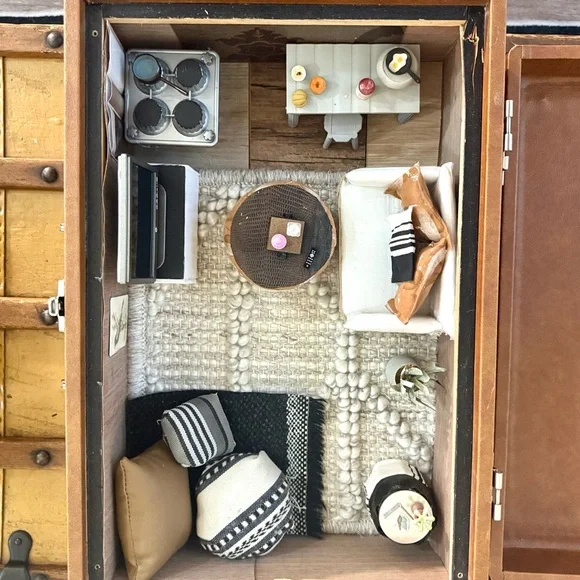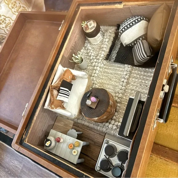 Tan leather record player suitcase turned mini dollhouse playroom. 95% handmade. Includes everything shown:CouchPillowsLazy CornerPlantsBookTV with RemoteOvenPots & PansFoodKitchen Table with StoolTrayOttomanTV StandSide TableThe lid comes off when opened too far. Makes it easier to play with. Can be fixed if desired.