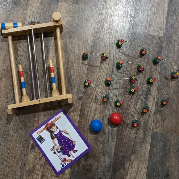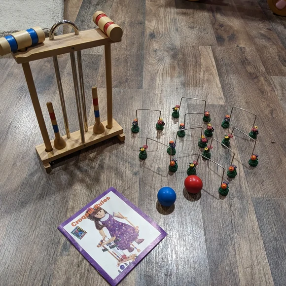 Vintage croquet set for your American girl doll. This set was part of some of the first items released in the ´90s for the American Girl of Today line. This is in like new condition includes the booklet as well.