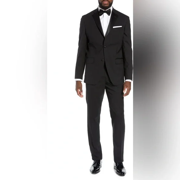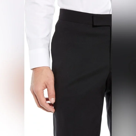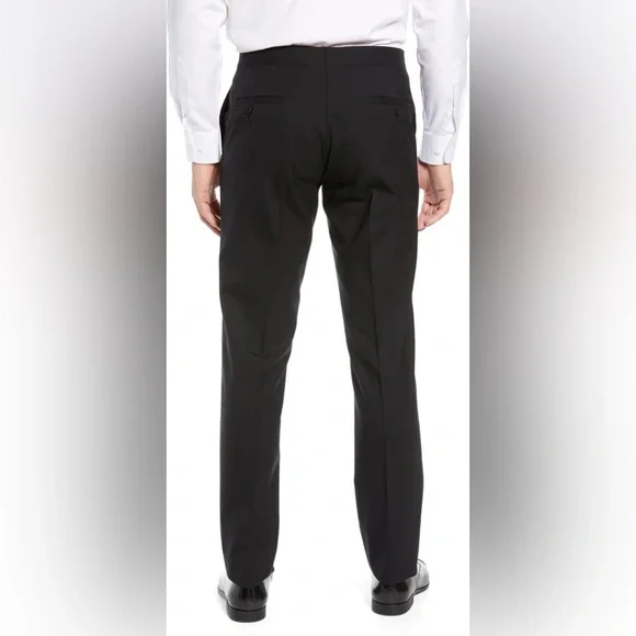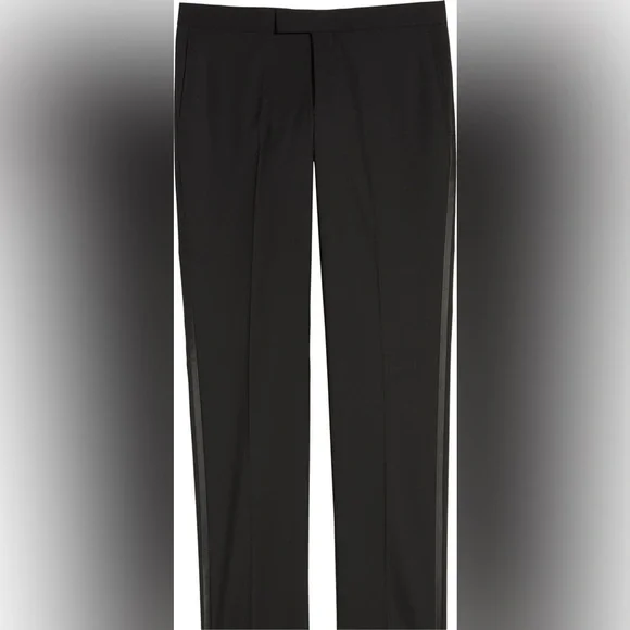 NORDSTROM Slim Fit Stretch Wool Tuxedo Dress PantsNWOTTrim-tailored tuxedo pants made from premium stretch wool are finished with satin side stripes for a suave, streamlined appearance.Slim but comfortable through seat and thigh.Tapers slightly below the knee for a narrower leg opening.Mid rise.Excellent conditionF2