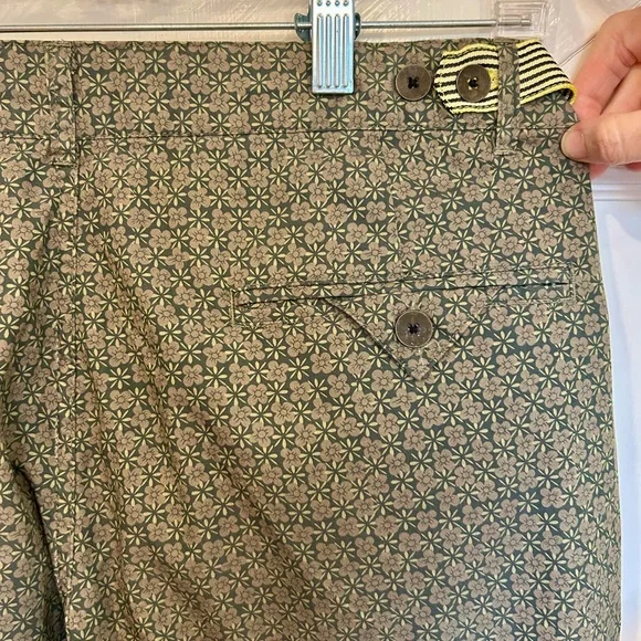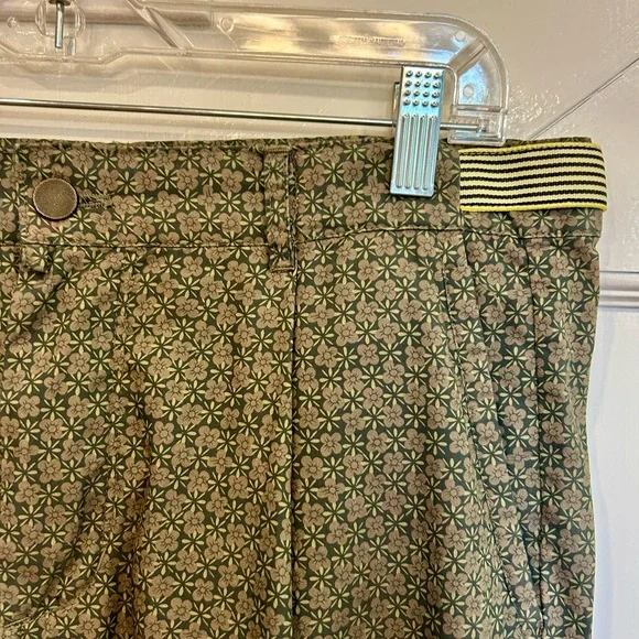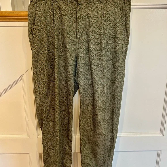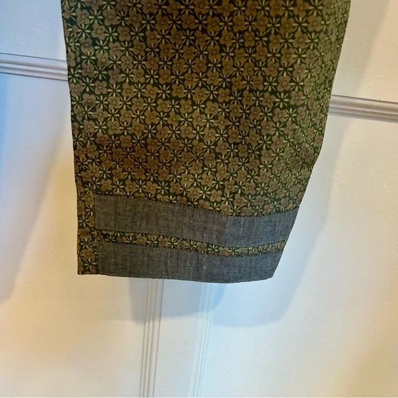 Stylish patterned trousers featuring a green and gray design. Perfect for a chic look. Limited edition 1/105. Style 8AL67811 born 12.15.2017 season 20. 65%cotton, 32%nylon 3%spandexMachine wash cold, hang dry, low iron setting
