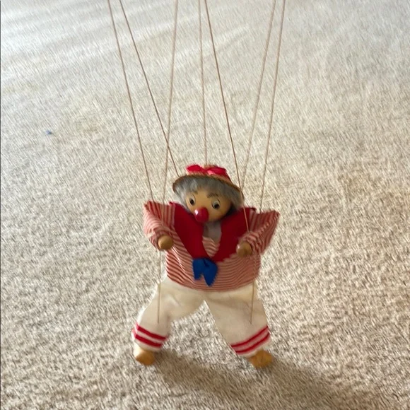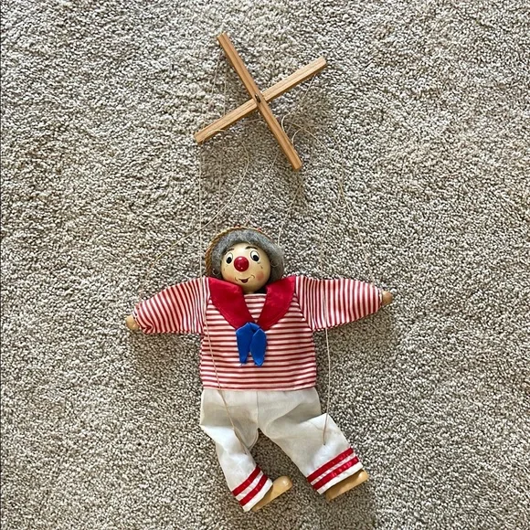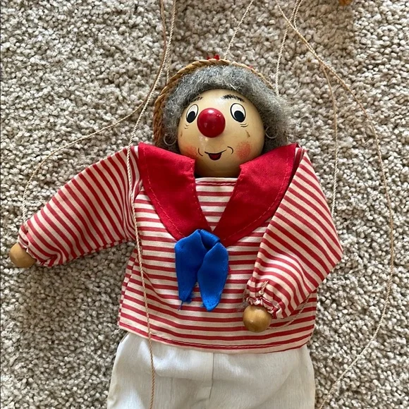 Delight your child with this charming puppet toy featuring a playful red and white striped outfit and a straw hat. Perfect for imaginative play.This puppet is handcrafted with wooden head, hands and feet.The body is stuffed cloth.Puppet measures 13".EUC