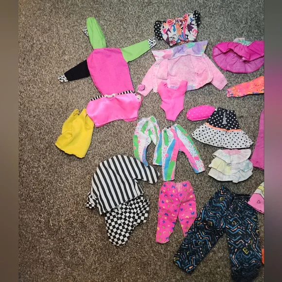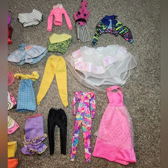 Lot of 38 Vintage 80´s & 90´s Barbie, Skipper, and Ken Clothes & OutfitsThere is some of the glitter paint on the Paint n Dazzle clothes - see photos. Otherwise in goodto great vintage used condition. Most are tagged with the Barbie tag but a few might not be Barbie.This works out to be less than $2/piece