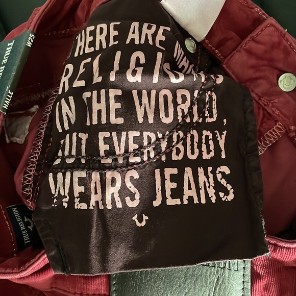 Brand new Halle super skinny corduroy true religion brand jeans. Color Cabernet - or red. Feel free to make an offer and bundle with my other great true religion stuff!!! Compare at 169.00 plus tax!!
