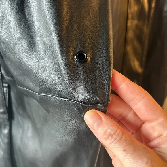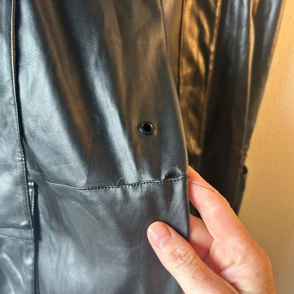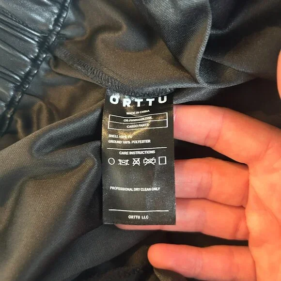 Description:▪️Orttu Vegan Leather Cargo Pants▪️Size Large▪️Black color▪️Cargo style, tie around waist through belt loops. Condition:▪️Preowned condition, small stitching issue near knee▪️No rips, just slightly loose