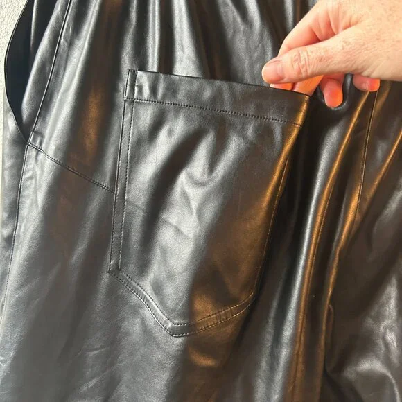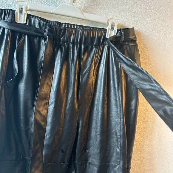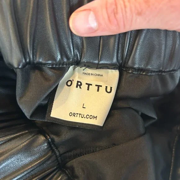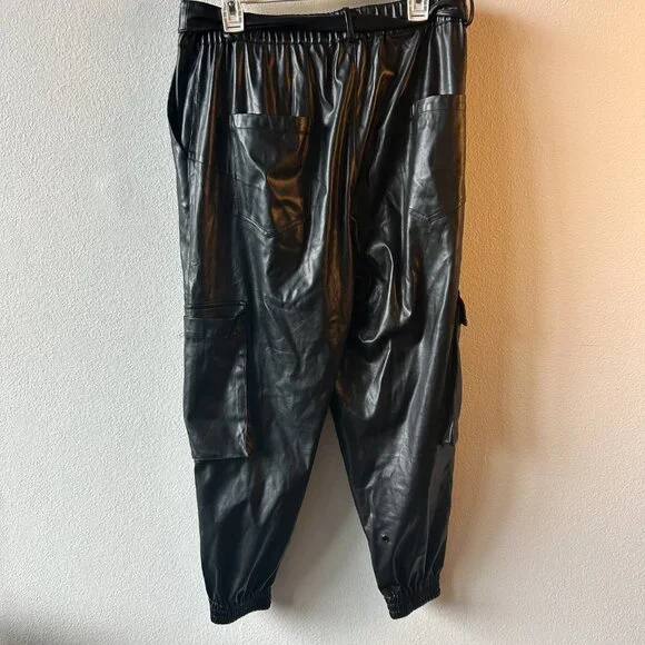 Description:▪️Orttu Vegan Leather Cargo Pants▪️Size Large▪️Black color▪️Cargo style, tie around waist through belt loops. Condition:▪️Preowned condition, small...