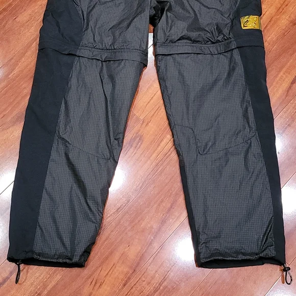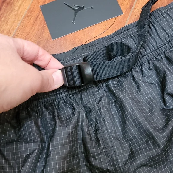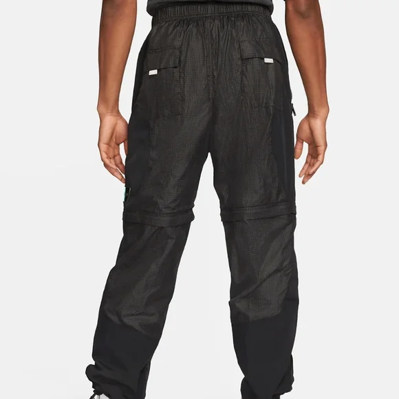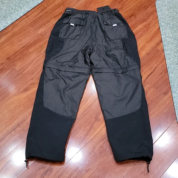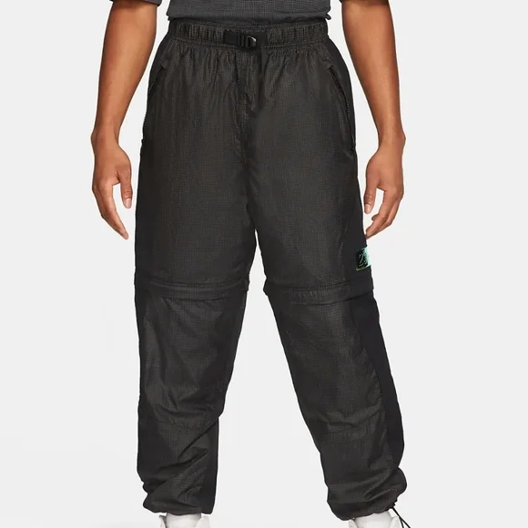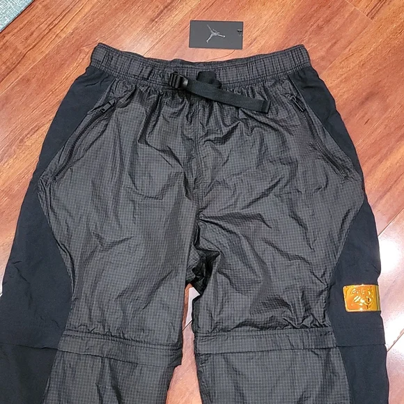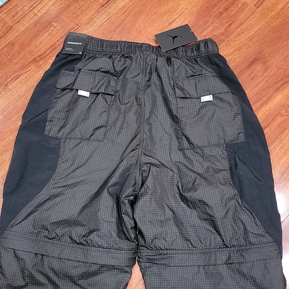 NWT Men´s size M Jordan 2 in 1 convertible wind pants. They are mesh lined from waist to knee and lined with parachute/swishy material from below knee to hem. It has 2 front zip pockets, 2 back velcro pockets, toggles at cuffs to adjust them, adjustable waist and zippers along knees to zip off the legs and turn these into shorts. Style is standard fit.