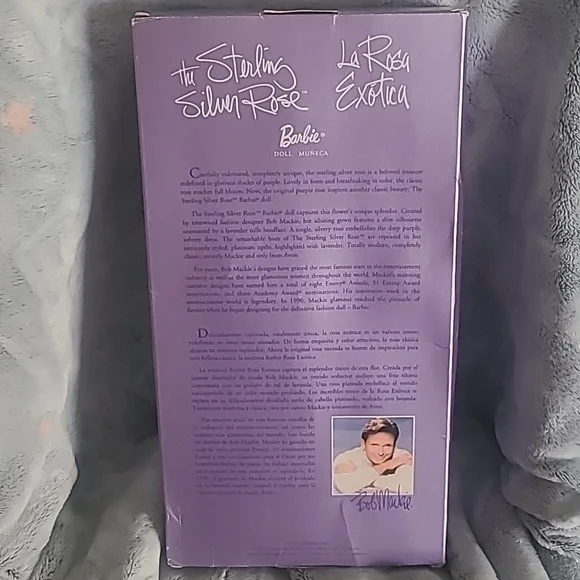 Barbie The Sterling Silver Rose Doll in elegant black and purple attire. Collector´s edition with exquisite design. La Rosa Exotica Bob Mackie design. Barbie has never been taken out of the box. Please review photos and video that show the condition of the box.