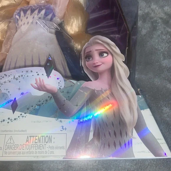 Disney Frozen IIMagic In MotionElsa DollJakks Pacific Ages 3 and upIncludes 1 Doll, 1 Dress and 1 Pair of shoesDoll measures approx. 13 inchesAmazing Lifeflike MovementSings "Show Yourself"Elsa´s mouth and head move to the musicRequires 3 AAA batteriesItem will need battery replacement due to shelf lifeNew in Box (box with minor shelf wear)Smoke free home
