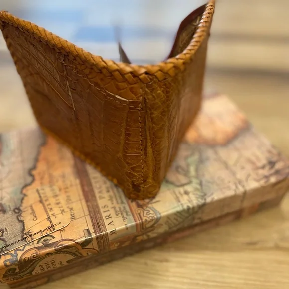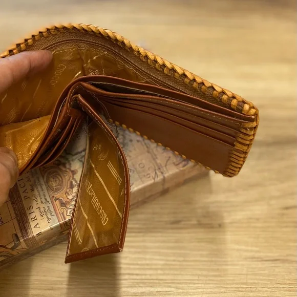 This stylish brown leather wallet features intricate tan stitching, offering a classic and durable design. Perfect for organizing your essentials with multiple card slots, hand...