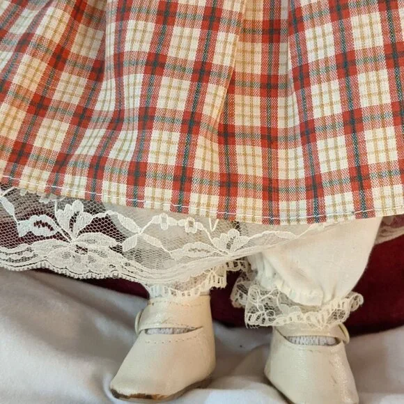 This is a beautiful doll with a soft body.She has PorcelainFace, Hands16 Inches tallDressed in an adorable dark red plaiddressand a precious hat.Original clothes, shoes.Great Christmas, Birthday or just because gift.New but NO BOX