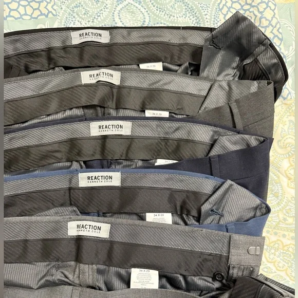 Upgrade your wardrobe with these men´s pants. Available in a variety of black, gray, and blue, these pants offer both style and comfort for any occasion. Bundle of FIVE Kenneth Cole Reaction Men´s Slim Fit Flat-Front Dress Pants Size 34x29. All are in excellent condition! Tags were removed and some never worn! $95 retail each pair! —Make a solid investment in these dress pants from Kenneth Cole Reaction that have a slim fit for a truly modern look. The slim cut follows through the hips and thigh and then narrows to a tapered ankle; creased at the front these suit pants have a fresh and crisp look that you can rely on again and again. Finished in a premium stretch, you can be assured comfortability and ease of wear throughout your busy day.FEATURES:Flat frontZip fly with button and hook closure; belt loopsTwo side slant pockets; two back button-through welt pocketsStretch fabricSlim trousers with a tapered leg