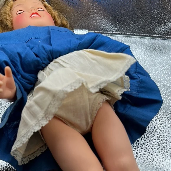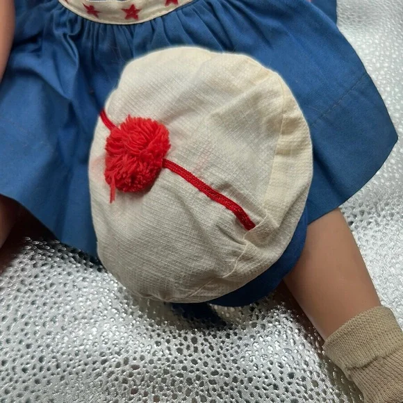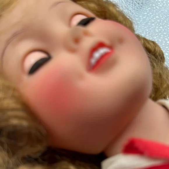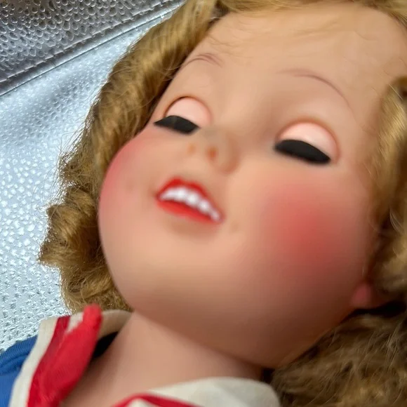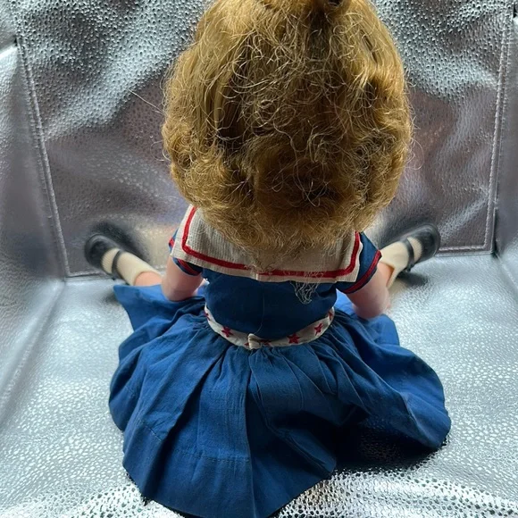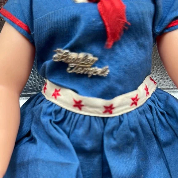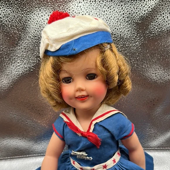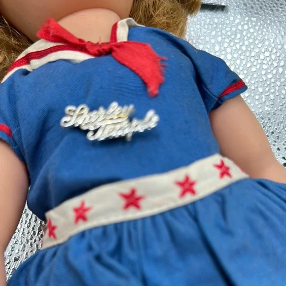 Vintage Shirley Temple doll is dressed in a charming blue sailor-style dress with red accents, complete with a pleated skirt and sailor collar. The outfit is complemented by a white sailor cap with red trim, embodying a classic nautical theme. Perfect for imaginative play, this doll is a wonderful addition to any toy collection.Also included as the Shirley Temple pin her adorable little dimples and eyes that open and close