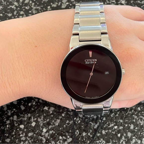 Axiom´s refined yet sleek design offers a day-to-night fashion options for the avid trendsetter. with a black dial and the intriguing feature of edge-to-edge glass and date.Movement: Eco-Drive J165Functions: Date, 2 HandBand: Silver-Tone Stainless Steel Bracelet, Fold Over Clasp with Push ButtonCase Size: 40mmCase Material: Silver-Tone Stainless SteelCrystal: Mineral CrystalWater Resistance: WR Splash Resistant