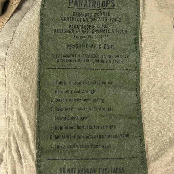 *Up for sale is an awesome used Vintage Abercrombie & Fitch Paratrooper Military Cargo Pants Green Mens Medium in GOOD condition. Condition 4/5 but it has a stain and small damage. See last 2 pictures please! Zoom in! Color is between a green/tan.**Keep in mind that you are not buying a new item, so please make sure you know what you are buying!•Excellent condition (condition 5/5 - like new - no damage - no stains - barely used)•Very good condition (condition 4/5- no damage - no stains - used more frequently)•Good condition (condition 3/5 or 4/5 or 5/5 - item may have stains or damages)MEASUREMENTS are provided in one of the pictures!****Please be advice color may appear more vibrant, lighter/darker in pictures due to flash, contrast, lighting or your phone/computer screen set up. *****Items will be pack carefully but they will/may need to be iron/steam.******Pet/smoke free working-shipping area.For seller : Storage ZQ