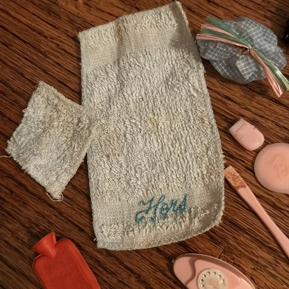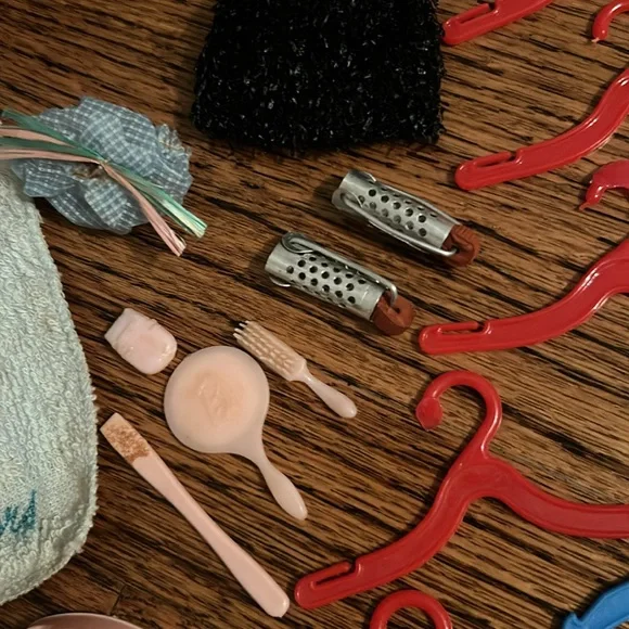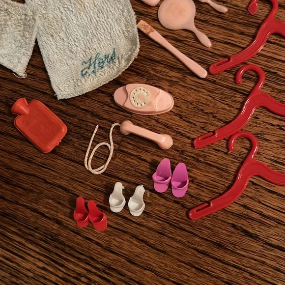 1969s Barbie Accessories. Very Good Condition. 10 plastic hangers. Towel & wash cloth. Hot water bottle. 3 pair heels. Pink Princess Phone. Brush, mirror, electric razor, curlers....