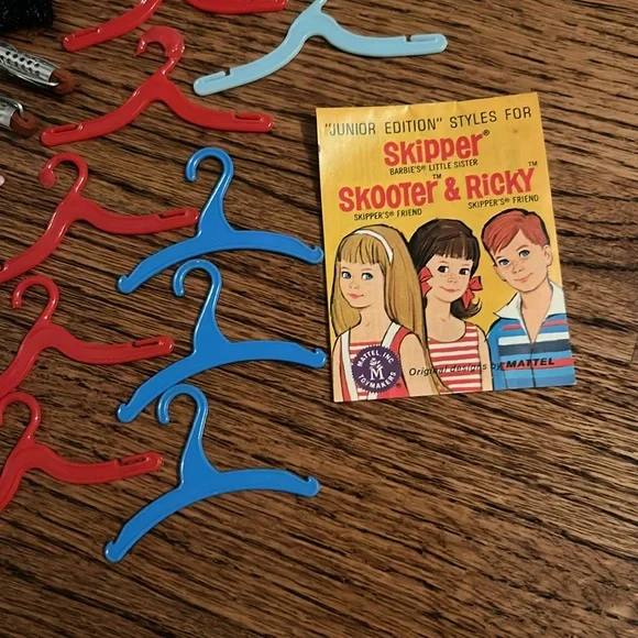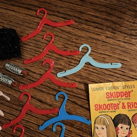 1969s Barbie Accessories. Very Good Condition. 10 plastic hangers. Towel & wash cloth. Hot water bottle. 3 pair heels. Pink Princess Phone. Brush, mirror, electric razor, curlers. Shower cap. Hat. Skipper, Skooter, Ricky Booklet. Pet/Smoke Free Hone.