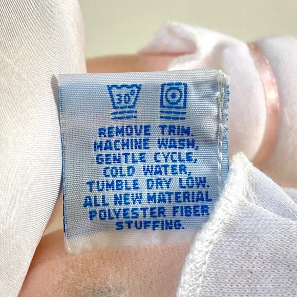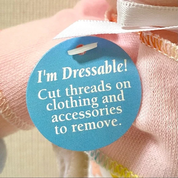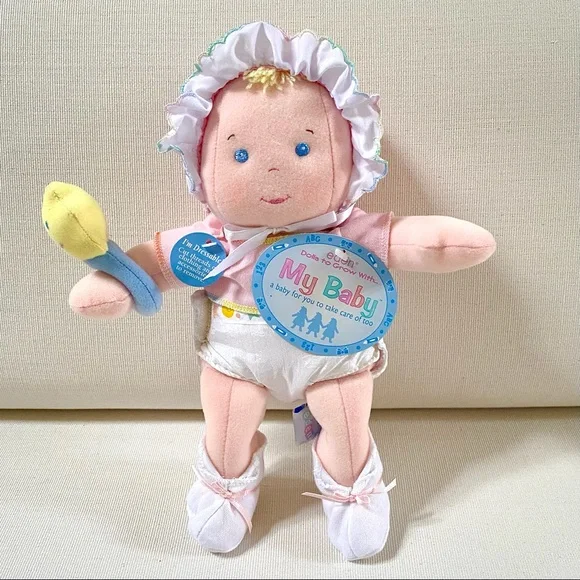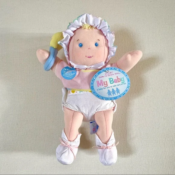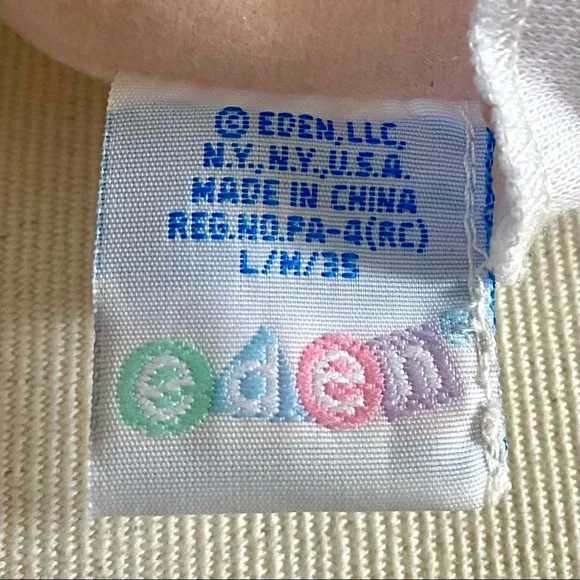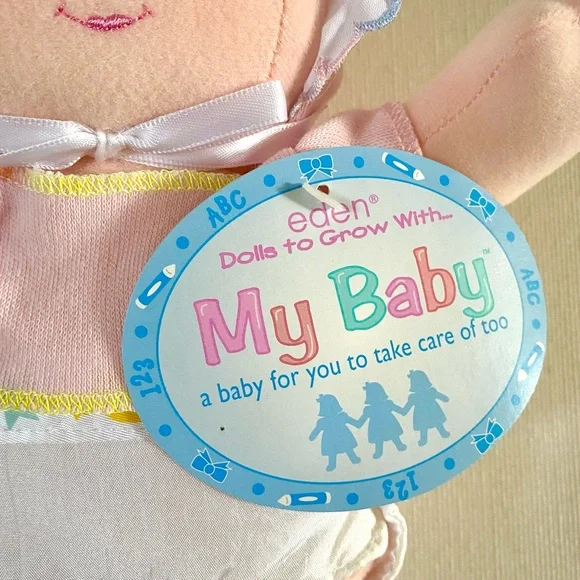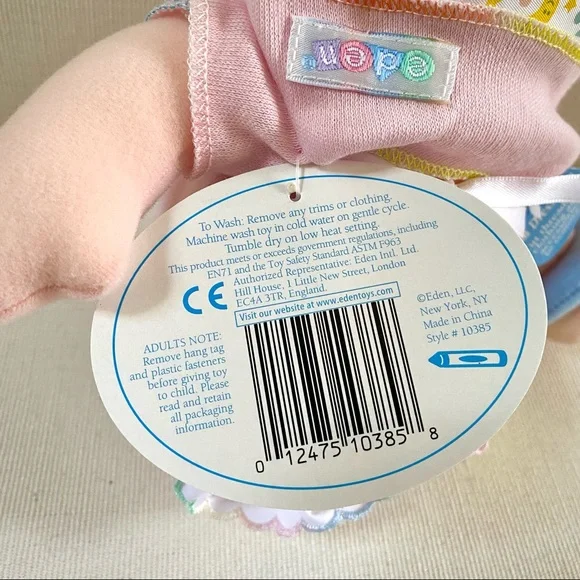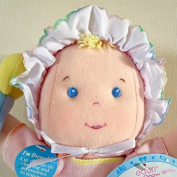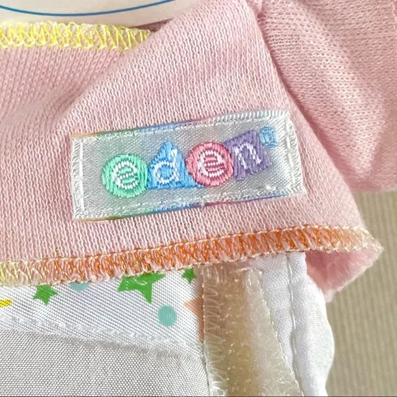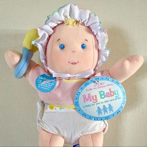 RARE Vintage 11” EDEN PLUSH CLOTH BABY DOLL with Clothes, Diaper, Booties and Rattle (clothes attached with threads). Although she was born in the 1990s, she is new with tags and in excellent new condition. She is wearing a bonnet and has blonde/yellow yarn hair and blue (baby safe) eyes. All of her clothes are removable. She has a rattle on her arm with an actual rattle inside.—BRAND: EDEN TOYS—VINTAGE from 1990s—RARE: Very difficult to find this Eden Baby Doll NWT (New With Tags) and here it is! —CONDITION: NWT. This Eden Plush Cloth BABY DOLL had been carefully wrapped and boxed and kept on a closet shelf until now. It is in excellent new condition.—Blond/yellow yarn hair—Blue (baby safe) eyes—Pink Shirt, Diaper, White Booties, Bonnet.—Baby Doll is dressable! Cut threads on clothing and accessories to remove. Baby hold a yellow/blue soft plush rattle that actually has a rattle inside—Ribbon bows on booties and bonnet tie—COLORS: Pastels—DIMENSIONS (Approximate)H: 11”W: 8.5” (with arms extended out)W: 4” (across waist)D: 3.5”*Comes from a smoke free, pet free home*The photos in this gallery are of the VINTAGE EDEN PLUSH CLOTH BABY DOLL you will receive