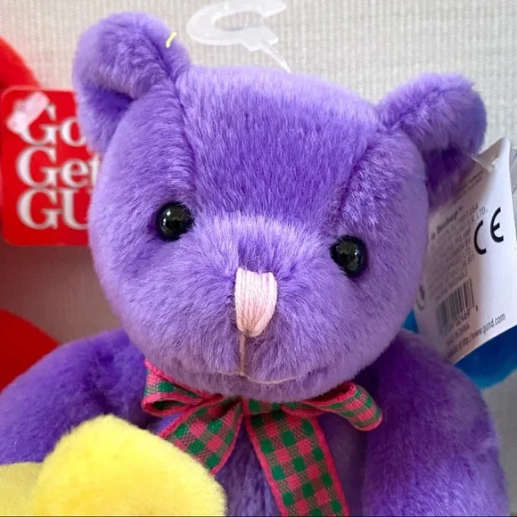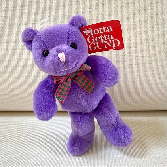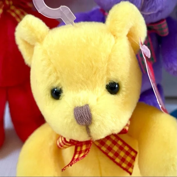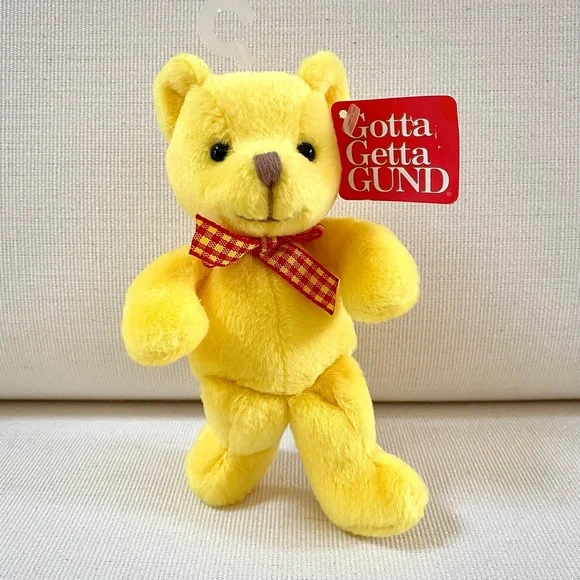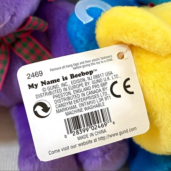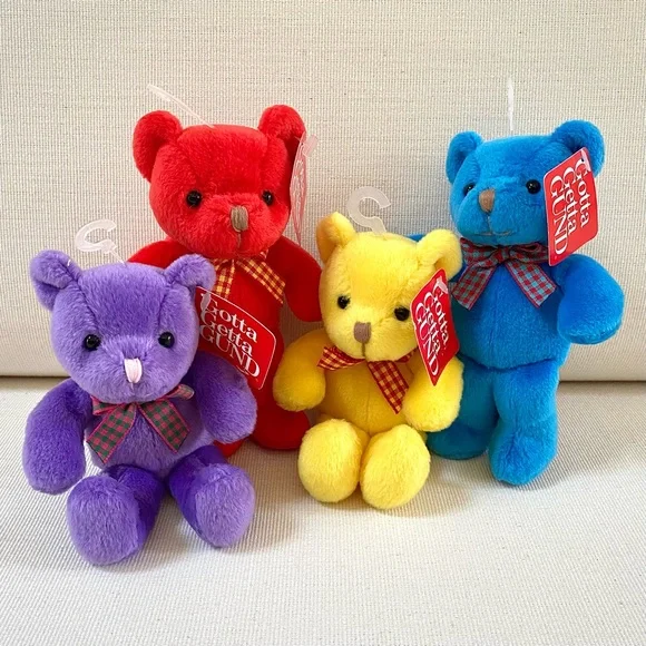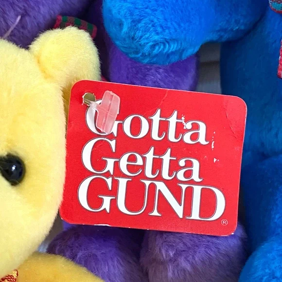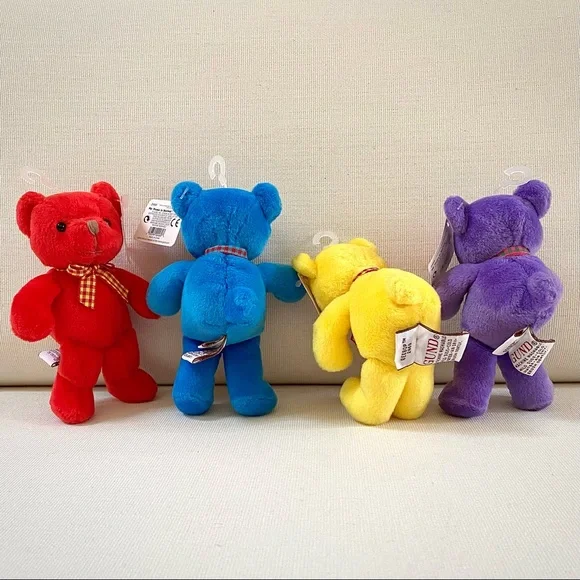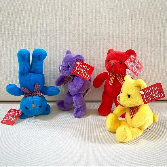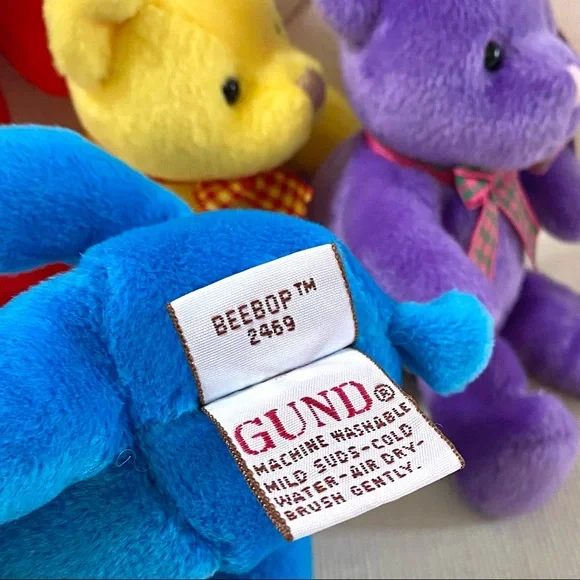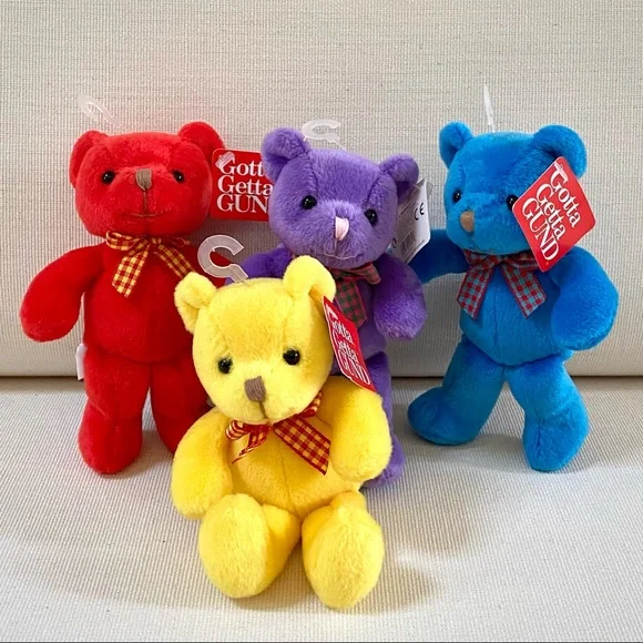 For more than 100 years, GUND has been a premier plush company recognized worldwide for the quality and innovation of their products.***Gotta Getta Gund***BEEBOP is truly unique! Designed to be small, colorful and simple yet absolutely adorable. You won’t find another GUND BEEBOP anywhere; especially 4 which are all new with original tags in place. This group of 4 BEEBOP’S are full of love and want to go home with you!—BRAND: GUND—VINTAGE FROM 1990s—BUYER GETS ALL 4! One of each color—RARE, Difficult to find vintage GUND small Teddy Bears, especially for 4, all new with original tags —STYLE NAME: BEEBOP—STYLE #: 2469—HANDMADE —CONDITION: New with Tags. These 4 GUND BEEBOP Teddy Bears were carefully wrapped and boxed and kept on a closet shelf until now. Each are in excellent new condition. —Embroidered Nose—Beaded Brown Eyes —Plaid Neck Ribbon —COLORS: Blue, Yellow, Red, Purple—CLEANING: Machine washable with mild suds, cold water, air dry, brush gently (see image)—CONTENT: Polyester fibers —DIMENSIONS (APPROXIMATE):H: 5.5 (when laying flat with legs extended)W: 4” (hand to hand at widest point)D: 2.75”*Comes from a smoke free, pet free home*The photos in this gallery are of the GROUP OF 4 VINTAGE GUND BEEBOP 5.5” TEDDY BEARS you will receive.