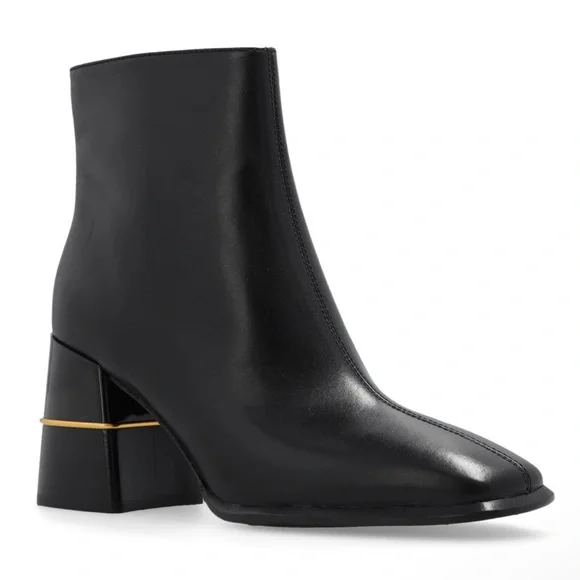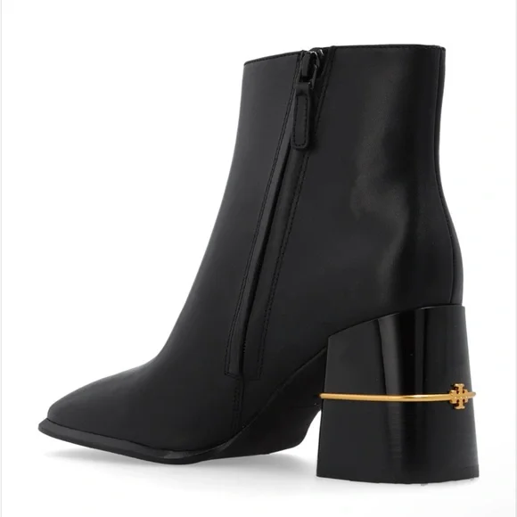 Black heeled ankle boots from Tory Burch. Made from calf leather, this model sits on a black sole in leather and rubber and features a side zipper and a distinctive heel accentuated with a gold-tone metal logo plaque.