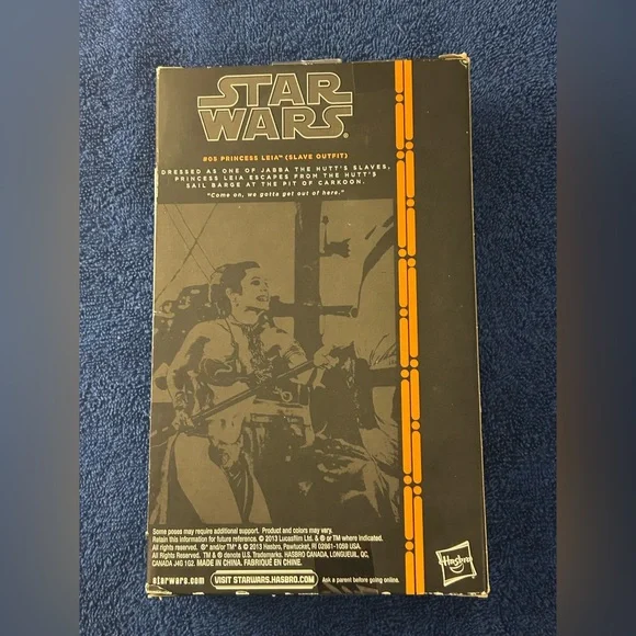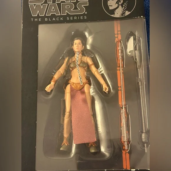 Star Wars The Black Series #05 Princess Leia (Slave Outfit) 6-inch action figure by Hasbro. New in box. Box has minor wear. Please see all pictures as part of the item description. The figure comes with accessories including a removable chain, a vibro axe, and a force pike. It was originally released in November 2013
