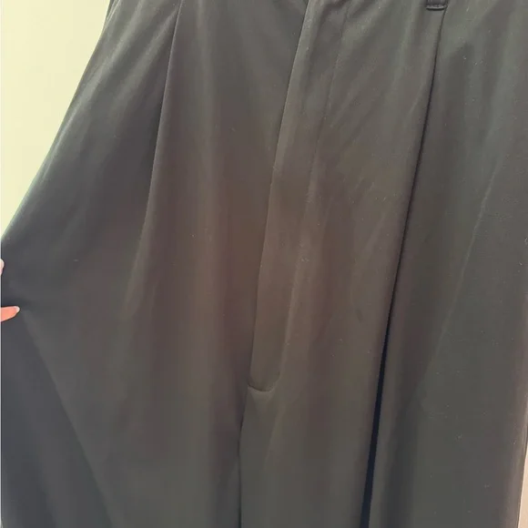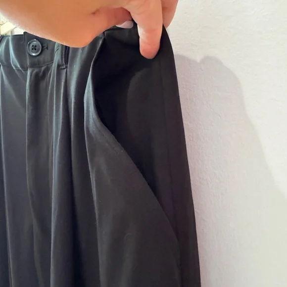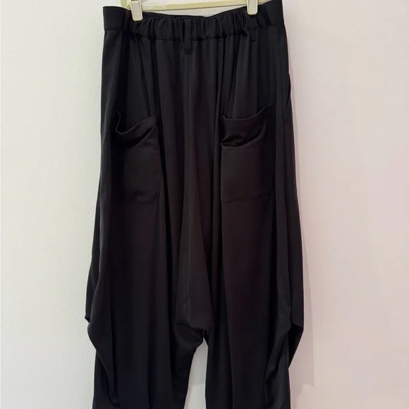 wide-leg design that tapers at the ankles, offering a modern and elegant silhouette. Crafted from a soft, draping fabric, they provide both comfort and style, making them perfect for formal occasions. The high waistline and pleated details add a touch of refinement to these versatile pants. Japanese brand I bought in Kyoto.