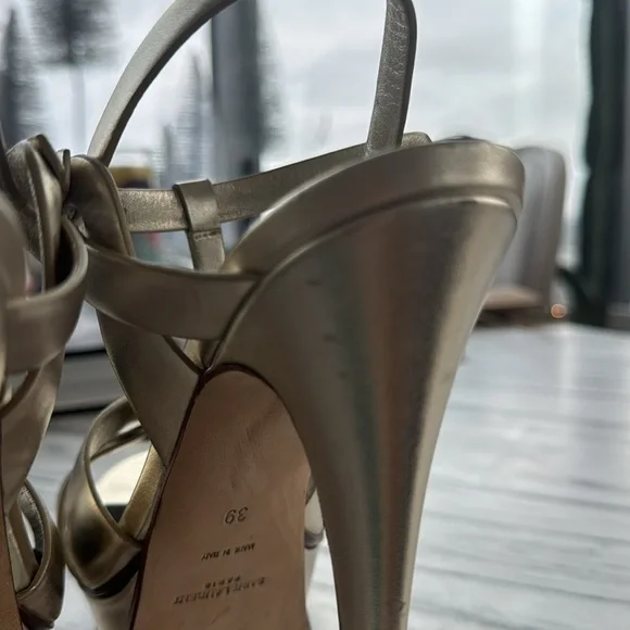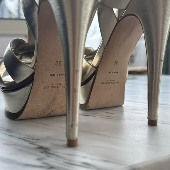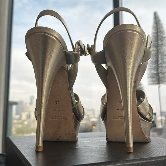 Yves Saint Laurent Tribute Sandal Platform. Color Sanda. Size 39. Authentic. Worn only once to a joyously awesome wedding. Good energy! Lovingly stowed in Original box, w 2 dust shoe bags, & authenticity cards. Light gold silver sheen. Slight scuff marks & wear to heels as pictured.