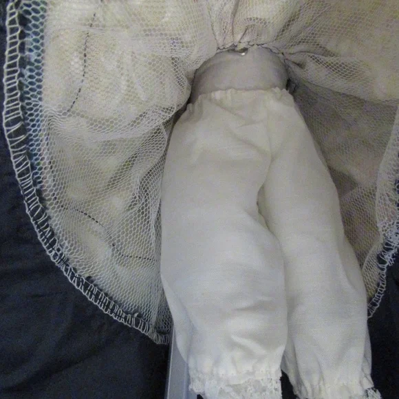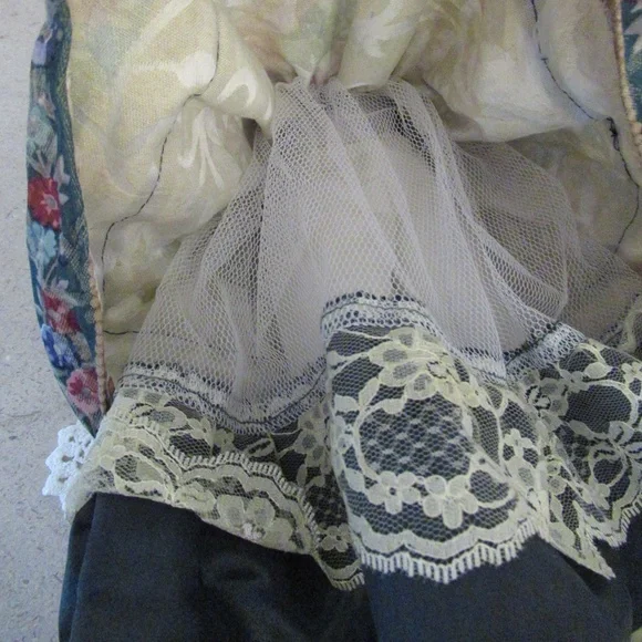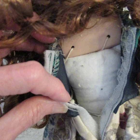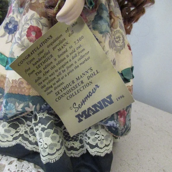 Vintage Seymour Mann Connoisseur Collection porcelain doll 1996 "Marla". Beautiful green acetate with beige, violet, red floral pattern dress with white lace underskirt. Marla is holding a matching drawstring bag and has a pearl choker necklace. Artist signature on back of doll neckmeasures: 17"Very good vintage condition, no rips, tears or stains