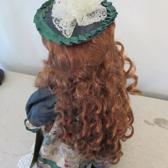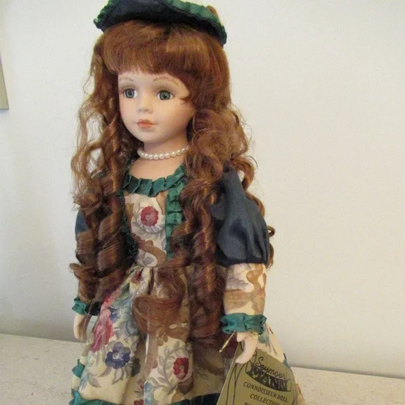 Vintage Seymour Mann Connoisseur Collection porcelain doll 1996 "Marla". Beautiful green acetate with beige, violet, red floral pattern dress with white lace underskirt. Marla is...