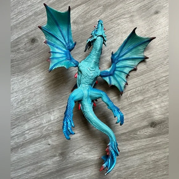 Retired dragon figurine from Schleich. Blue and red dragon with ball jointed wings and hinged/ opening jaw. Pearlescent detail on wings. Excellent condition, only flaw to note is a small hairline scratch under the neck, see photos. Retired and harder to find. Approx 9 3/4 x 7 1/2.