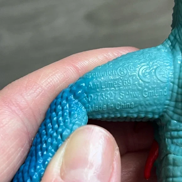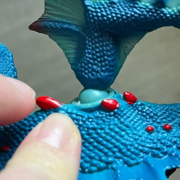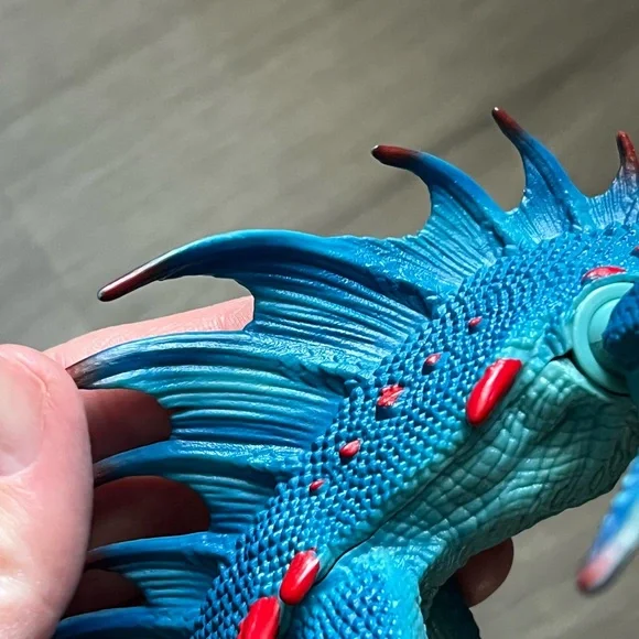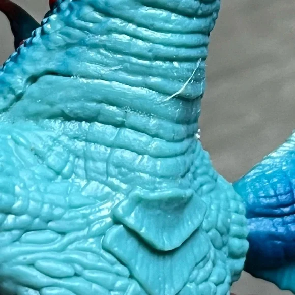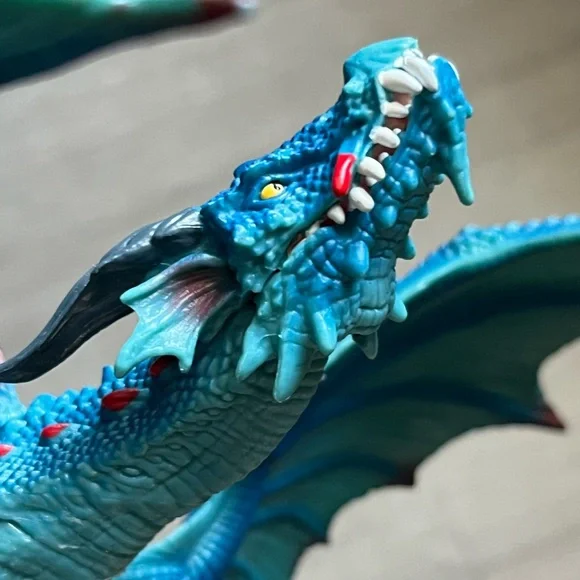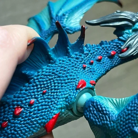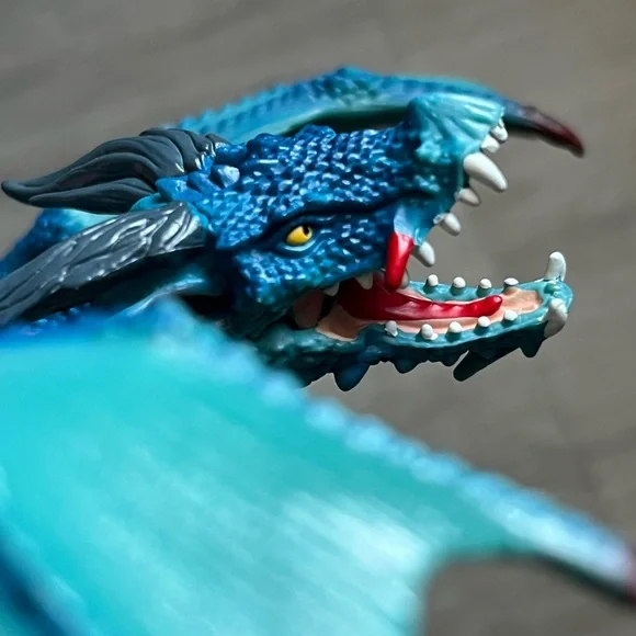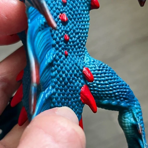 Retired dragon figurine from Schleich. Blue and red dragon with ball jointed wings and hinged/ opening jaw. Pearlescent detail on wings. Excellent condition, only flaw to note is...