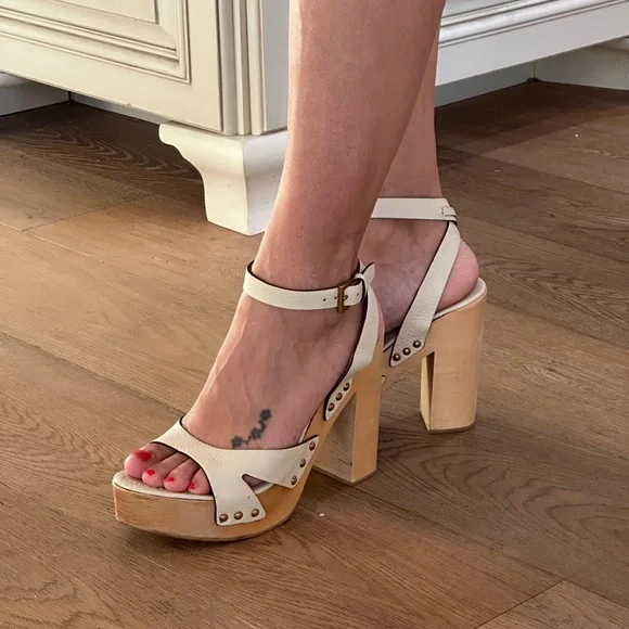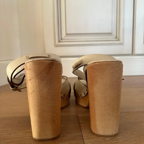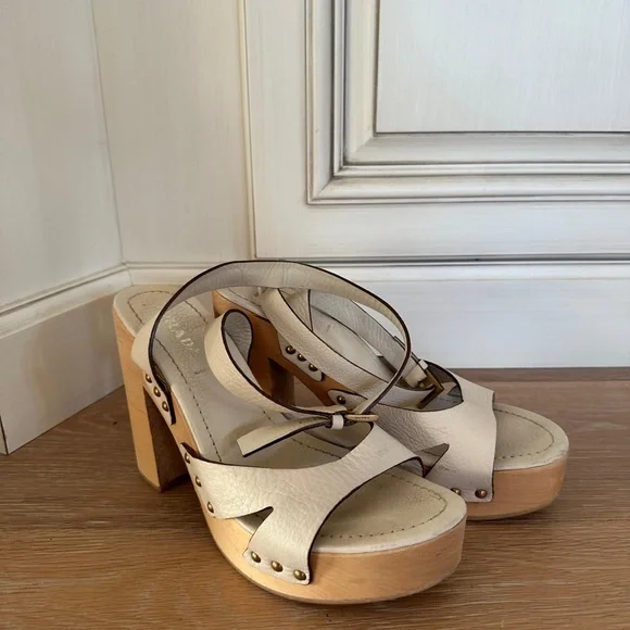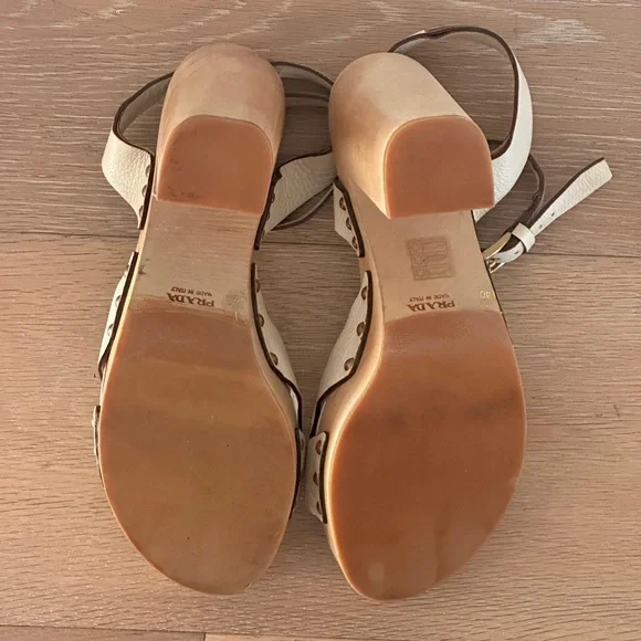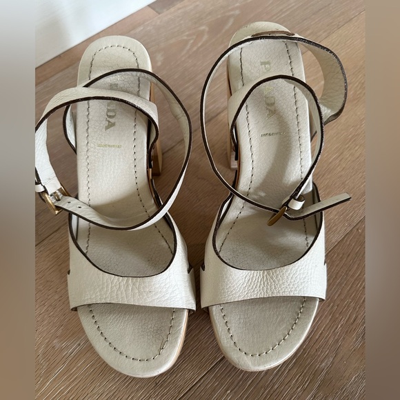 Gorgeous and rare Prada platform sandals featuring cream textured leather straps with antique gold-tone stud detailing. Set on a natural wood block heel and platform, these sandals are both retro-chic and incredibly wearable. The sculptural silhouette and premium materials make them a standout designer piece for any collection.•100% authentic Prada•Made in Italy•Cream pebbled leather upper•Gold-tone stud embellishments•Wooden block heel & platform•Slip-on style•Lightly worn, excellent condition (see photos)•From a smoke-free homeA bold statement heel that adds vintage charm and Italian luxury to any outfit.