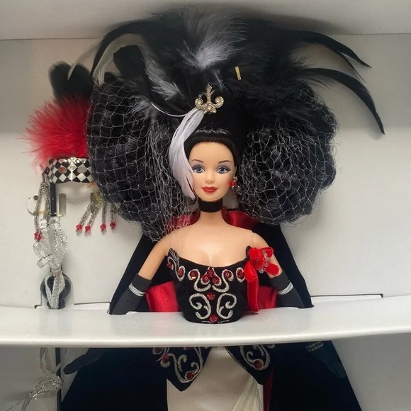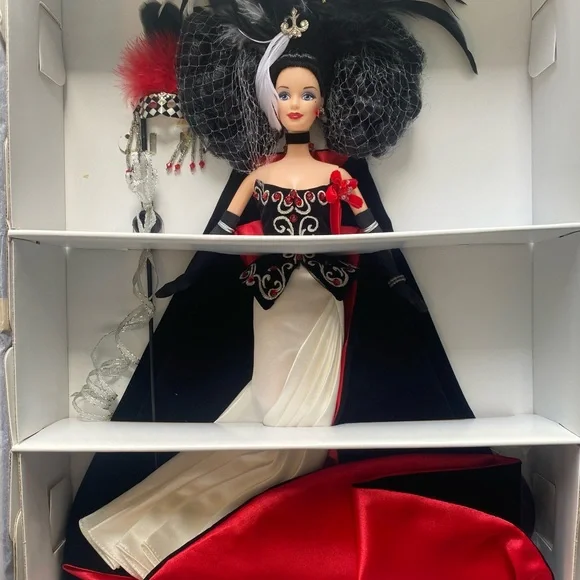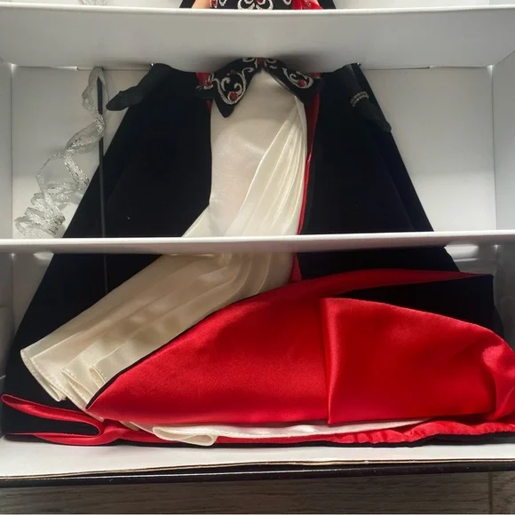 This exquisite doll features a striking black and red ensemble, complete with a dramatic feathered headpiece. Perfect for collectors and enthusiasts alike. Box has minor damage as seen in photos. Doll is in perfect condition.