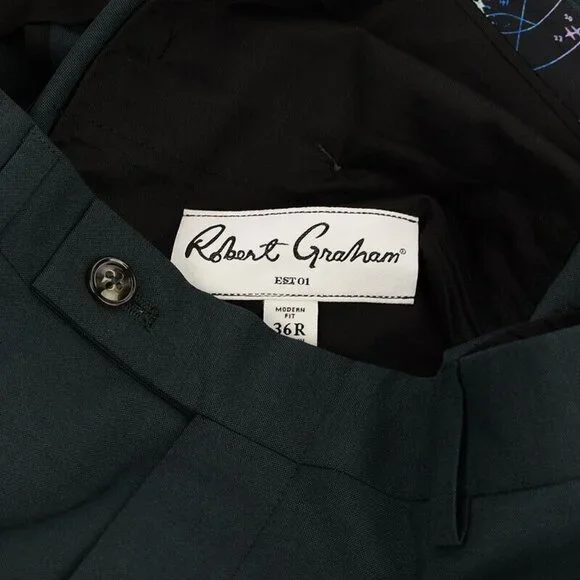 ROBERT GRAHAM Dark Green RUSSELL Modern Fit Wool Mohair Flat Front Dress Pants NWTSize: 36 RRobert GrahamMen´s PantsModel: RussellFit: ModernSize: 36 RegularDark GreenMade of 84% Wool, 15% Mohair & 1% ElastaneDry Clean OnlyFlat FrontExtended Button & Zipper ClosureCoin PocketSlant Pockets2 Back Button Welt PocketsBelt Loops10" RiseWaist: 36"Inseam: 36" (unfinished hem)New w/ Tags - No Defects