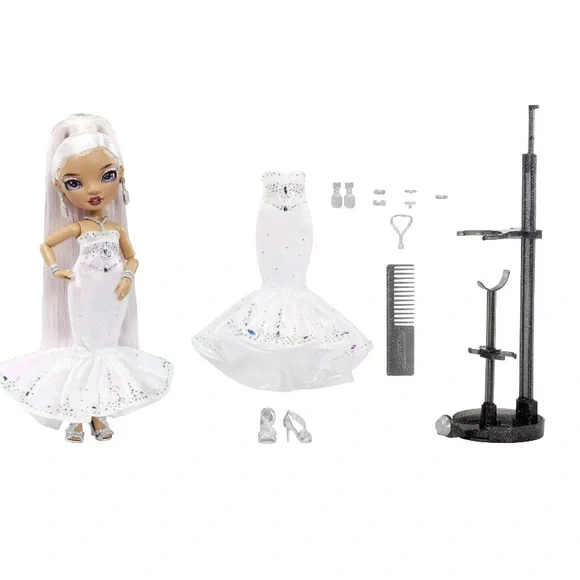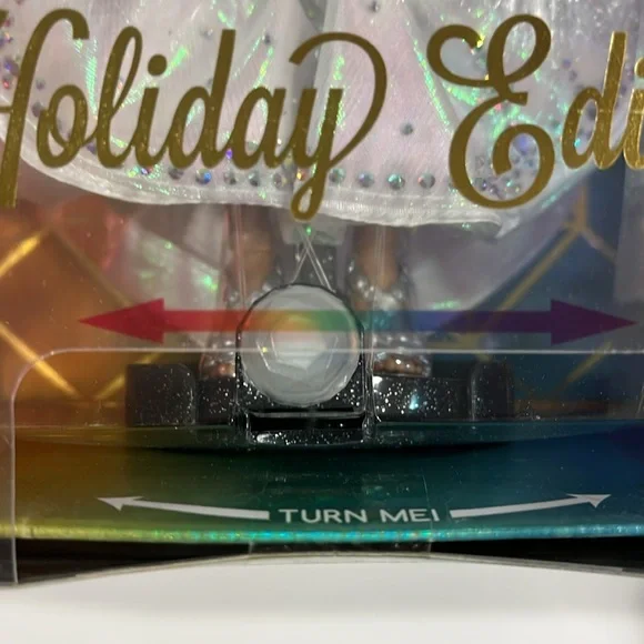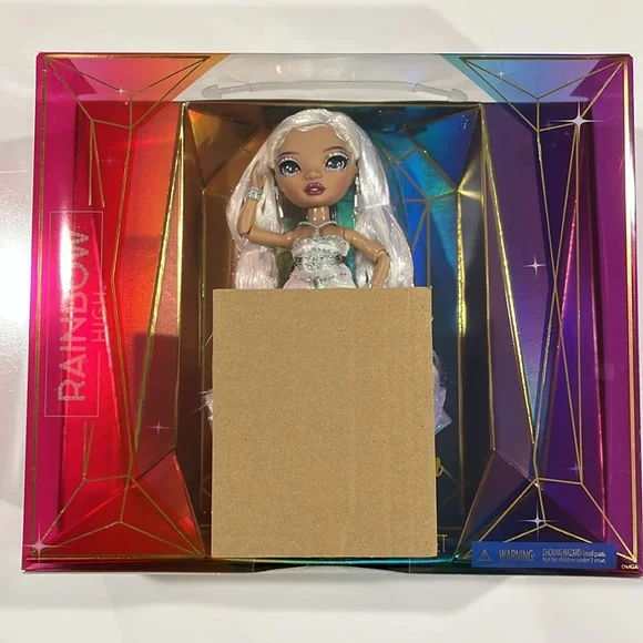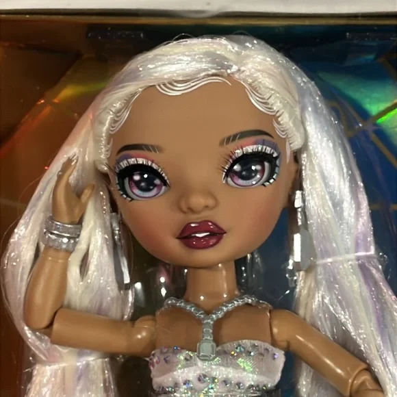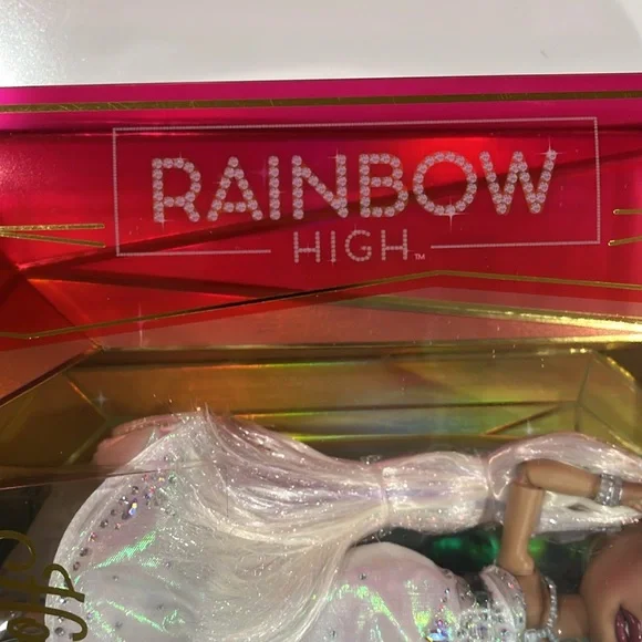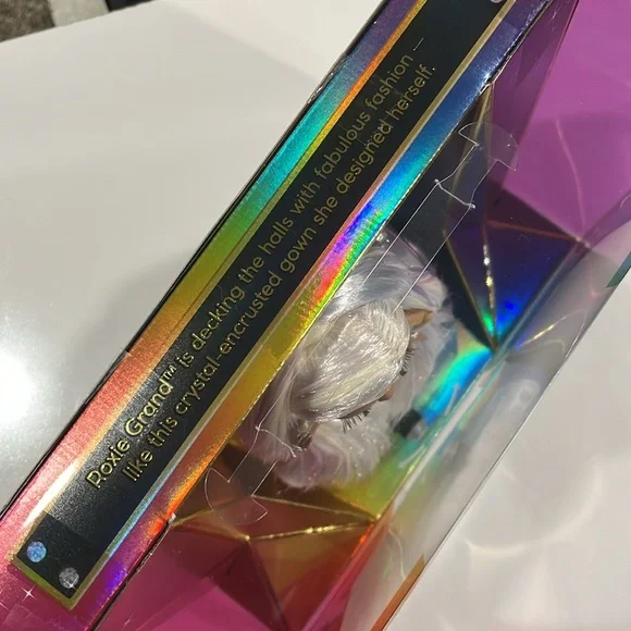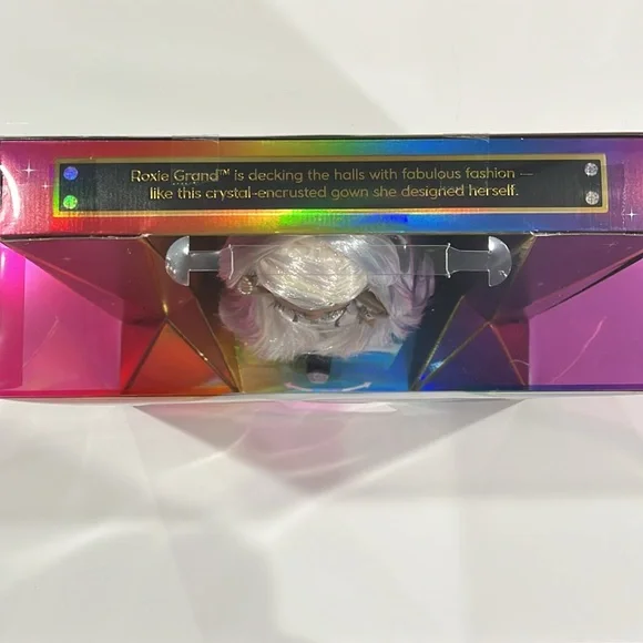 Rainbow High is celebrating the Holidays with the first ever Holiday Edition Fashion Doll - Roxie Grand. She comes wearing an iridescent organza dress with 683 rhinestones, diamond accessories, jeweled shoes: sparkling from head to toe! The luxe collector box is the perfect gift for the holidays. This special edition box is shaped as a diamond facet with Roxie Grand featured in the middle. STUNNING MULTICOLOR HAIR: Her hair sparkles as much as her outfit. She has long brushable iridescent hair that is pulled back in a fierce ponytail to showcase her beautiful glass eyes and long lashes.STYLING ACCESSORIES: Roxie is smart, and a force to be reckoned with. She comes wearing drool-worthy jewelry: six different diamond shape and color bracelets, a pair of emerald diamond earrings with RH logo, and a diamond necklace with cushion cut gem. MOVABLE STAND: Roxie Grand has impeccable style and not shy to the spotlight. She comes with a movable stand that can shift left to right-perfect for any camera moment.Great Gift for kids and Collectors of all ages.