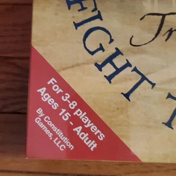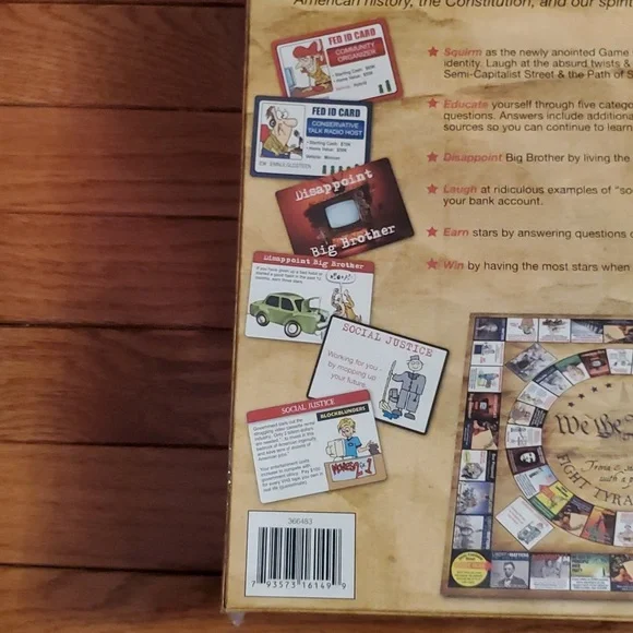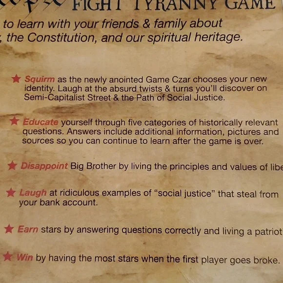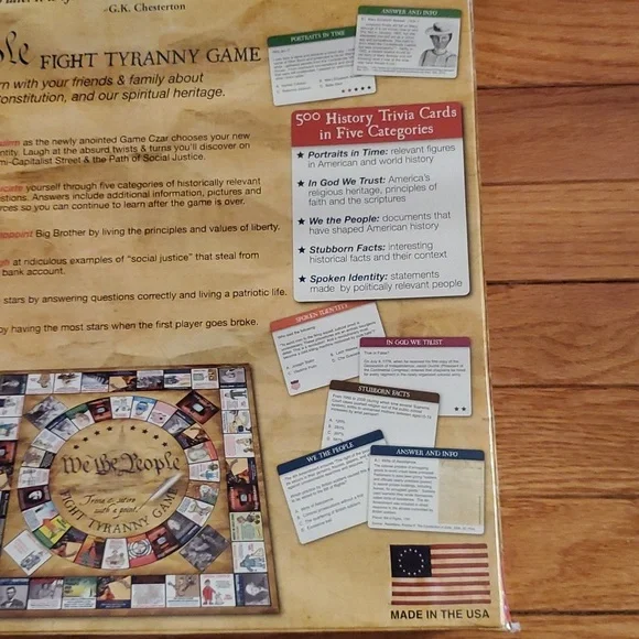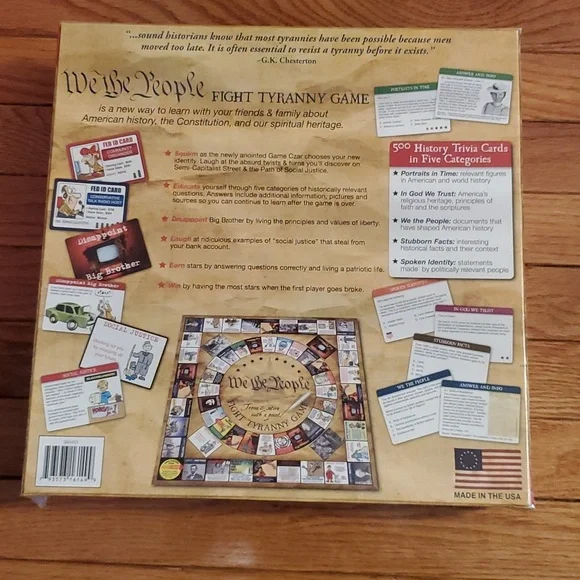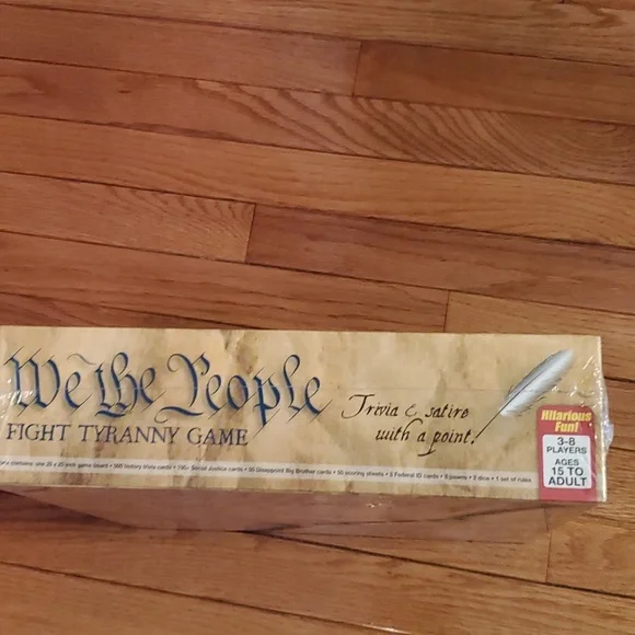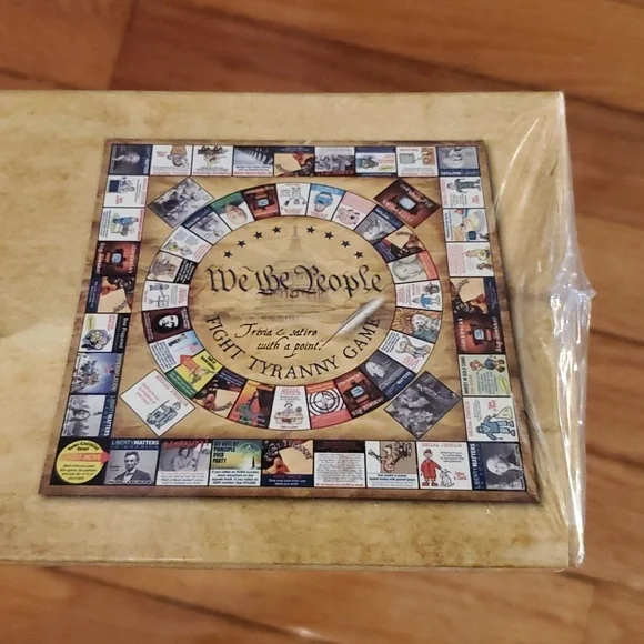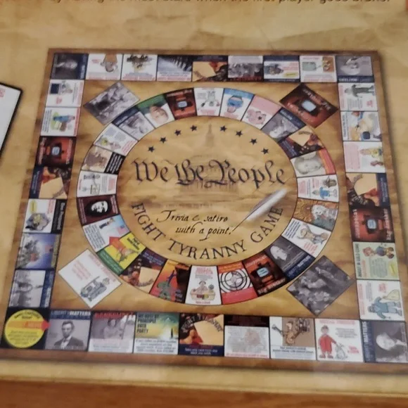 We the people trivia and satire with a point fight tyranny game, For 3 to 8 players ages 15 to Adult. This game contains25 / 25 inch gameboard 500 history Trivia cards 100 plus social Justice cards ,50 disappoint Big Brother cards, 50 scoring sheets, 8 federal ID Cards, 8 pawns., 2 dice, 1 set of rules We the people fight tyranny game is a new way to learn with your friends and family about American history the Constitution and our spiritual heritage new in sealed box.