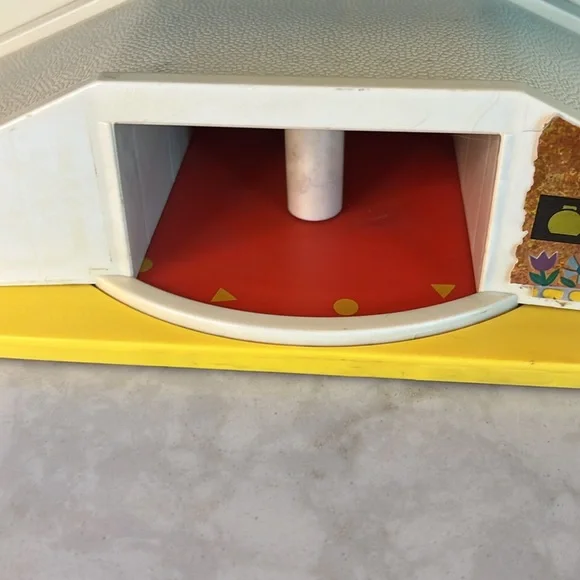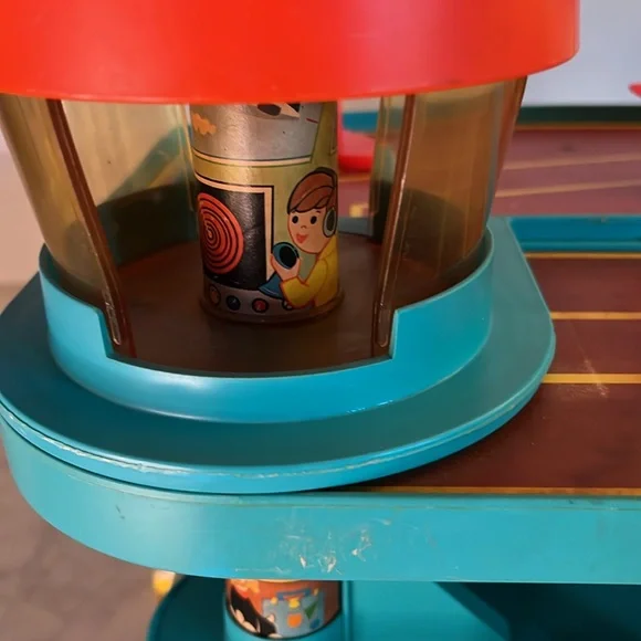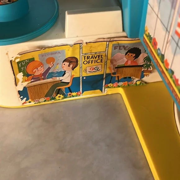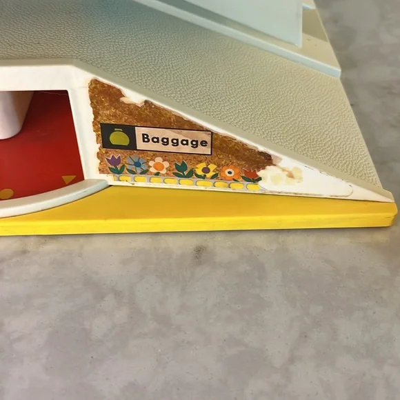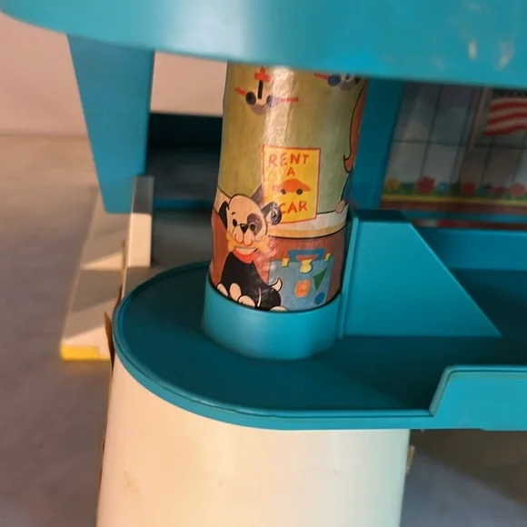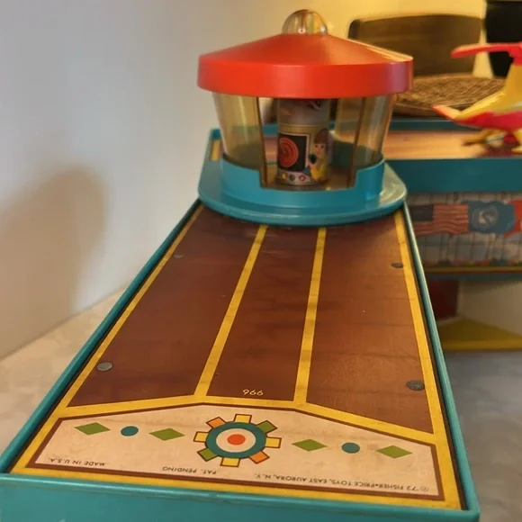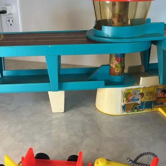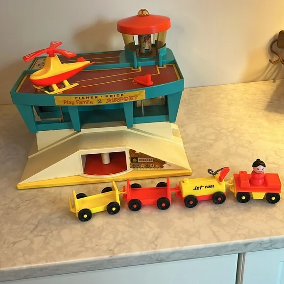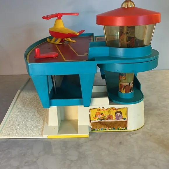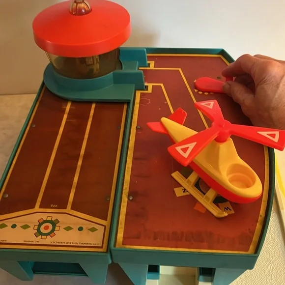 Vintage 1972 Fisher Price Play Family Airport with a helicopter that has spinning propeller and a fuel and luggage wagon with a plastic femal figure.It has some damage to the stickers as shown.Please see pix and video..This is a wonderful play set or use it as a display for anyone who flies or works in sn airport!