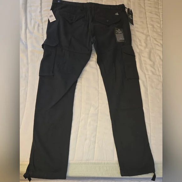 Stylish and versatile black cargo pants for men. Perfect for casual outings or outdoor adventures.Experience the perfect blend of style and functionality with these black cargo pants from PRPS. Crafted from durable materials, they feature adjustable ankle straps for a personalized fit and a straight leg design for a sleek look. sz 34/32