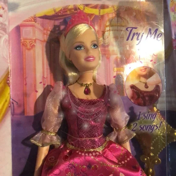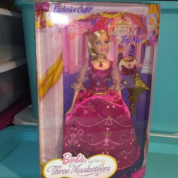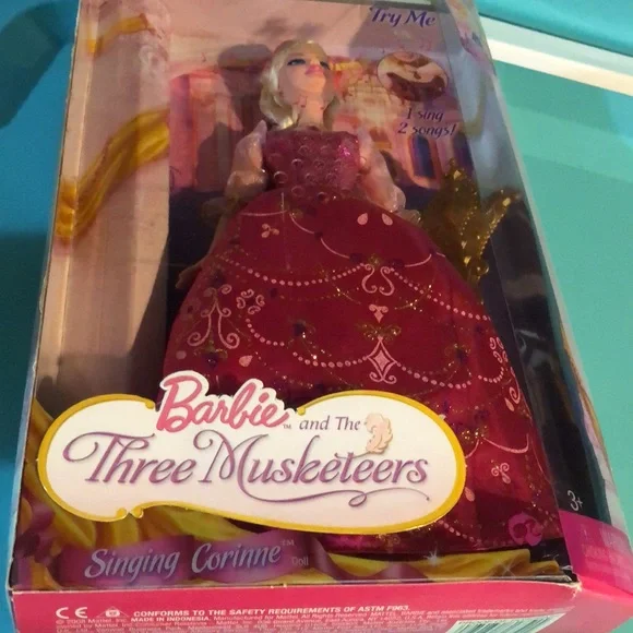 Barbie and the Three Musketeers Singing Corinne New doll. Barbie as Singing Corinne from the movie Barbie and the Three Musketeers.Box has minor wear, but in pretty good shape.Barbie doll’s batteries need to be changed so I am unable to show you the 2 songs she sings. The batteries that are required are 3AG13 (LR44) batteries.Please view all photos before purchasing.