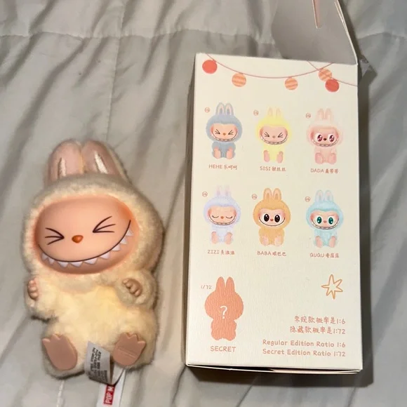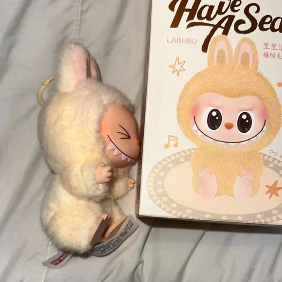 Adorable Pop Mart Labubu plush toy in cream and pink. Perfect for collectors. Authentic have a seat labubu “SISI” RARE!