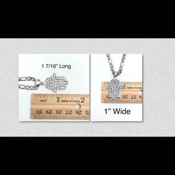 Created by artisans in Santa Fe, New Mexico, this striking solid .925 Sterling Silver Hamsa pendant is stunning. Can be worn by men and women. Comes on a stainless steel 4mm Figaro chain that is hypoallergenic, doesn’t tarnish, scratch, chip, or corrode. Should you like a sterling silver chain, contact me for options.PRICES ARE FIRM PLEASE!