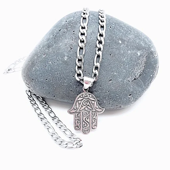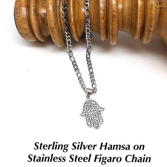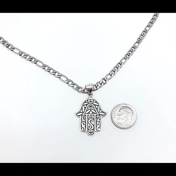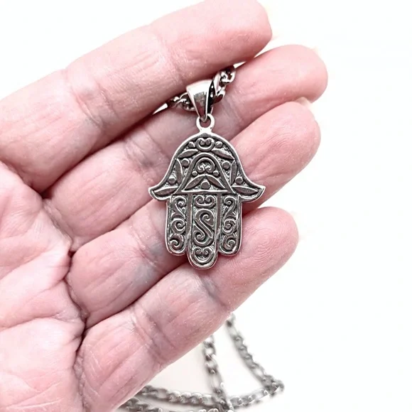 Sterling Silver Large Artisan Hamsa Necklace, Stainless Steel Chain, NEW, Box
